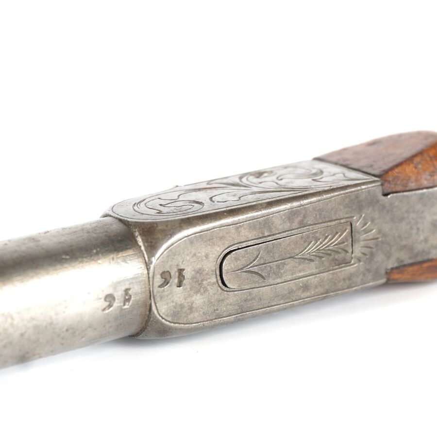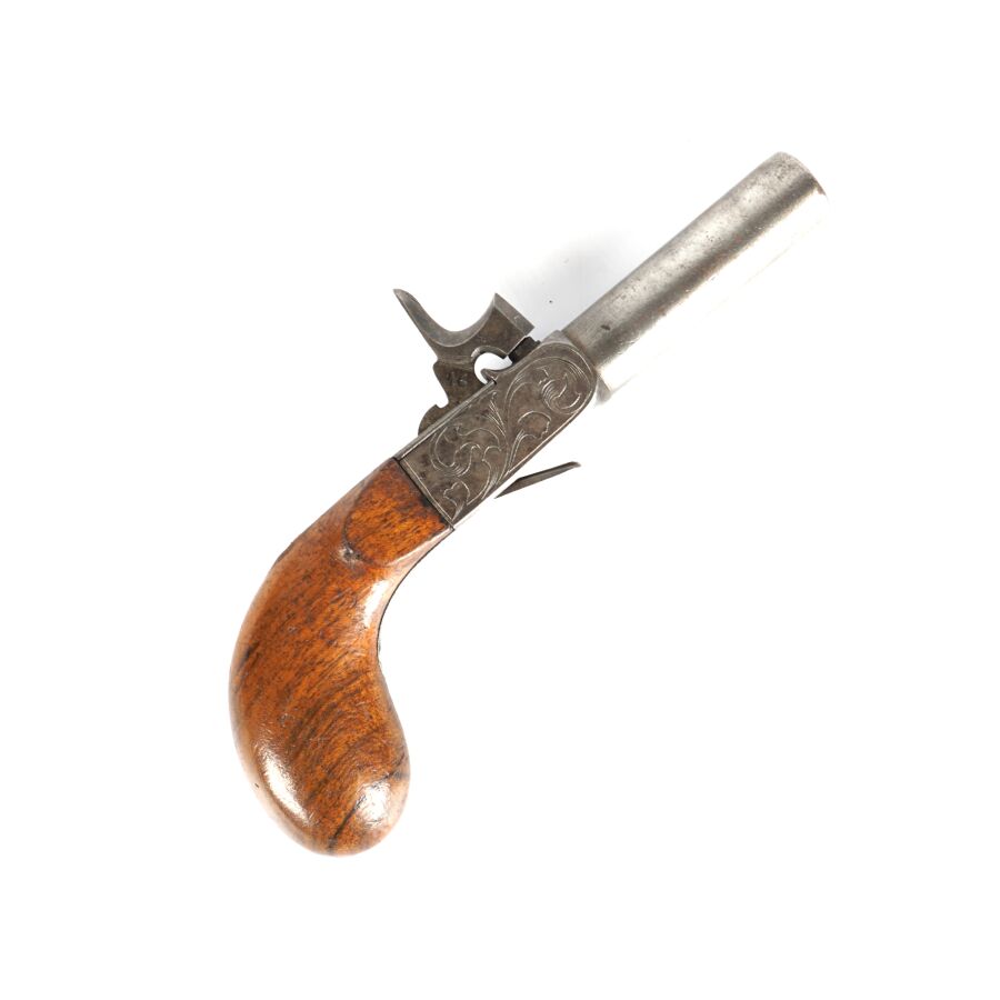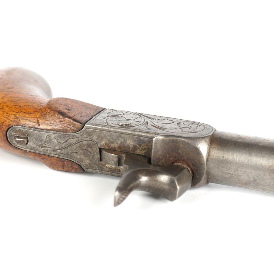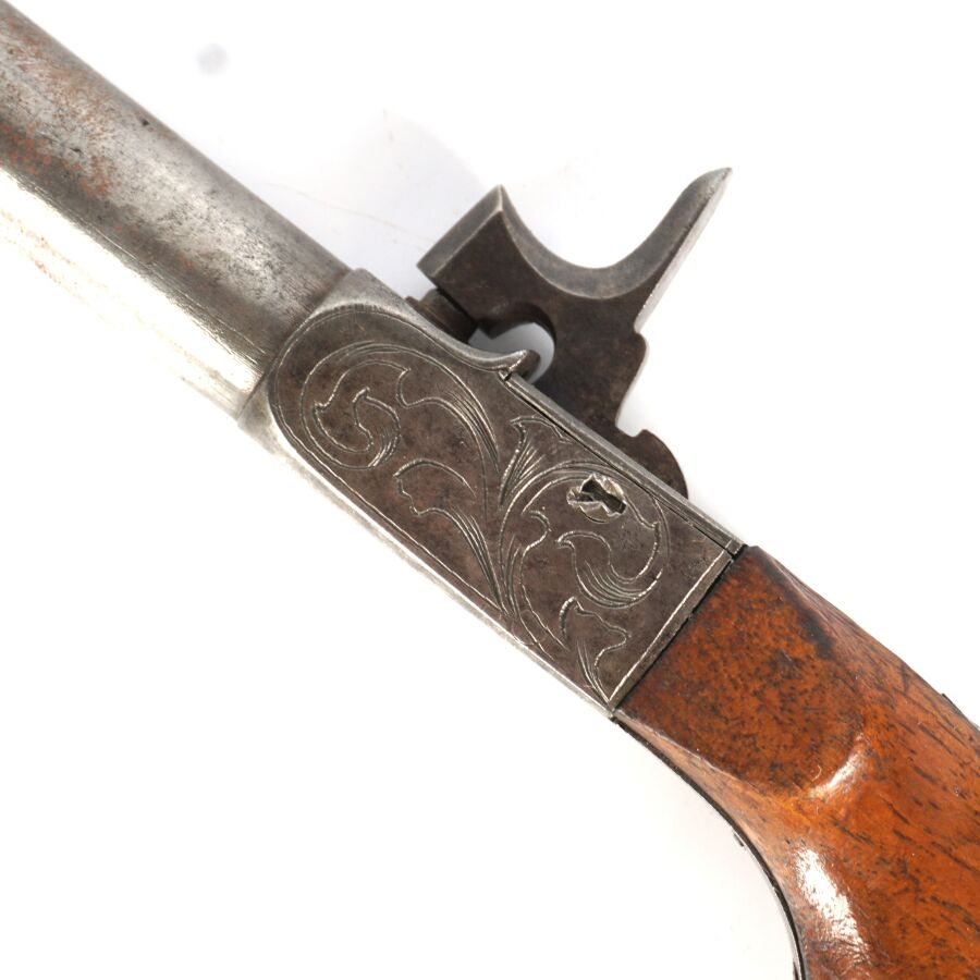 PISTOLET A BALLE FORCEE, platines à coffre à percussion à décor gravé de rinceaux feuillagés, canon rond de 6 cm à balle forcée, détente rentrante, crosse en noyer en forme de poire, mécanisme semblant fonctionnel, longueur totale : 17 cm, vers 1840, BE.