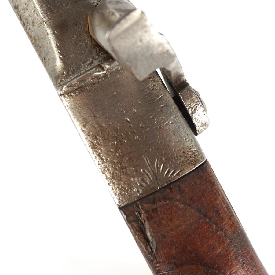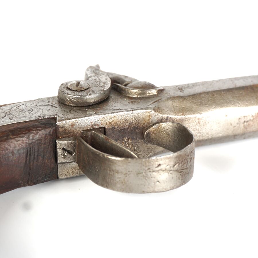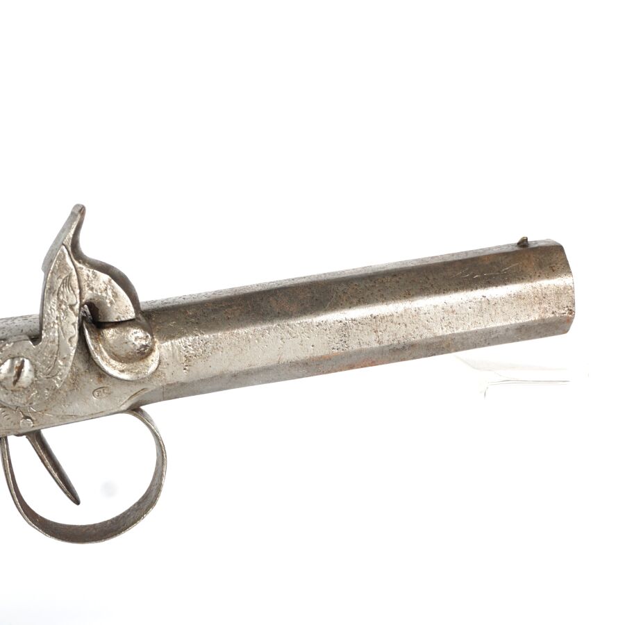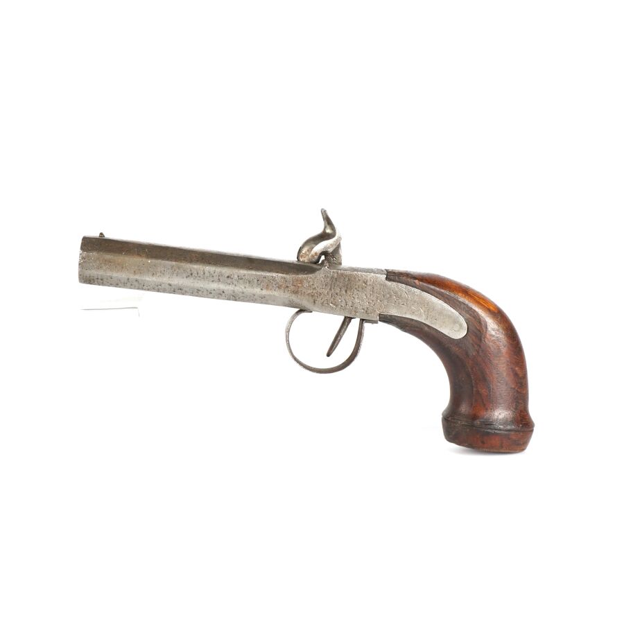 PISTOLET A BALLE FORCEE, platines à percussion à décor gravé de rinceaux feuillagés, canon rond de 9.5 cm à balle forcée, crosse en noyer en forme de poire avec repose-paume, toutes parties métalliques piquées, mécanisme non fonctionnel (mécanisme du chien à revoir et cheminée écrasée), longueur totale : 22.5 cm, vers 1840, EM.