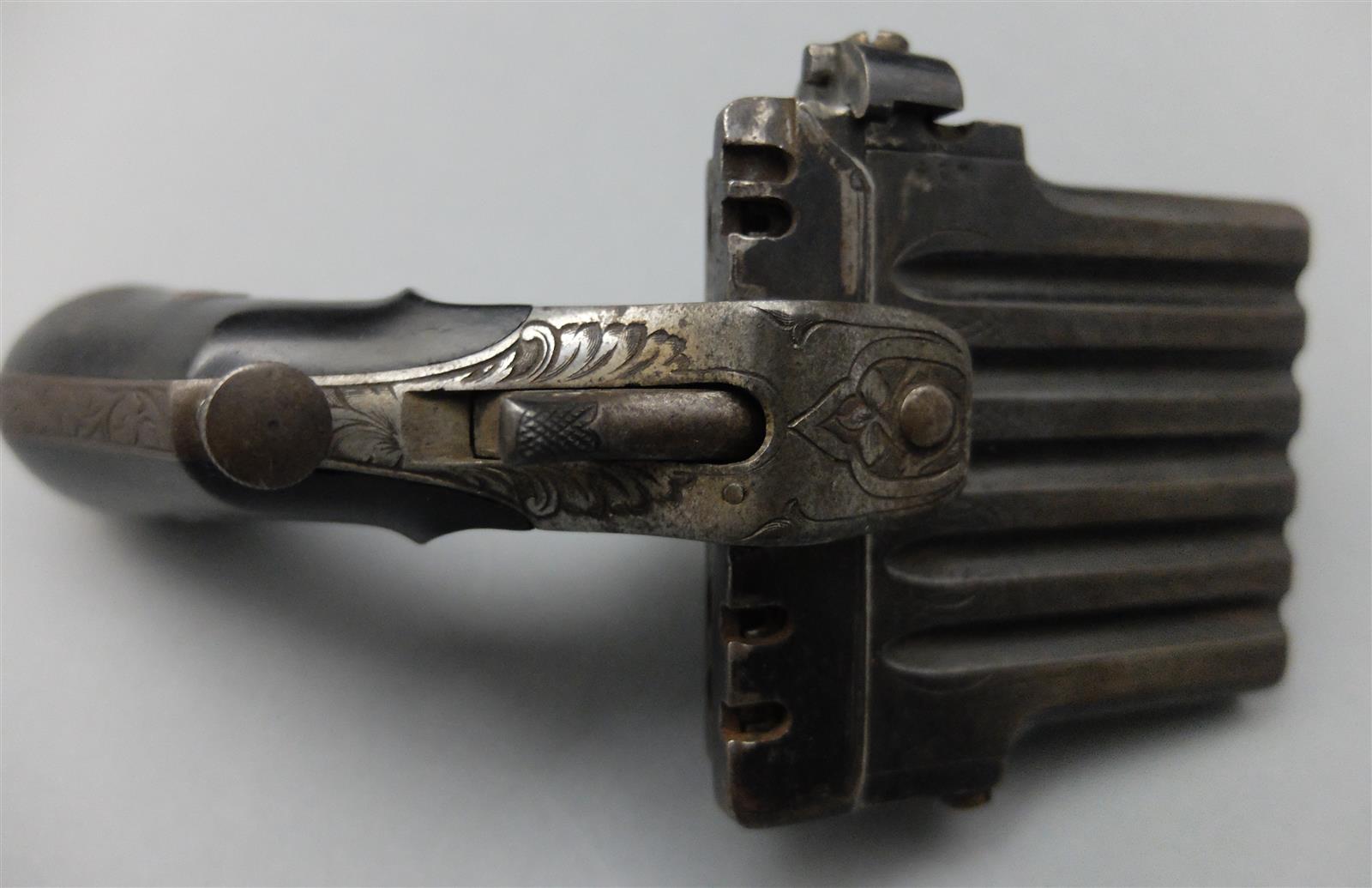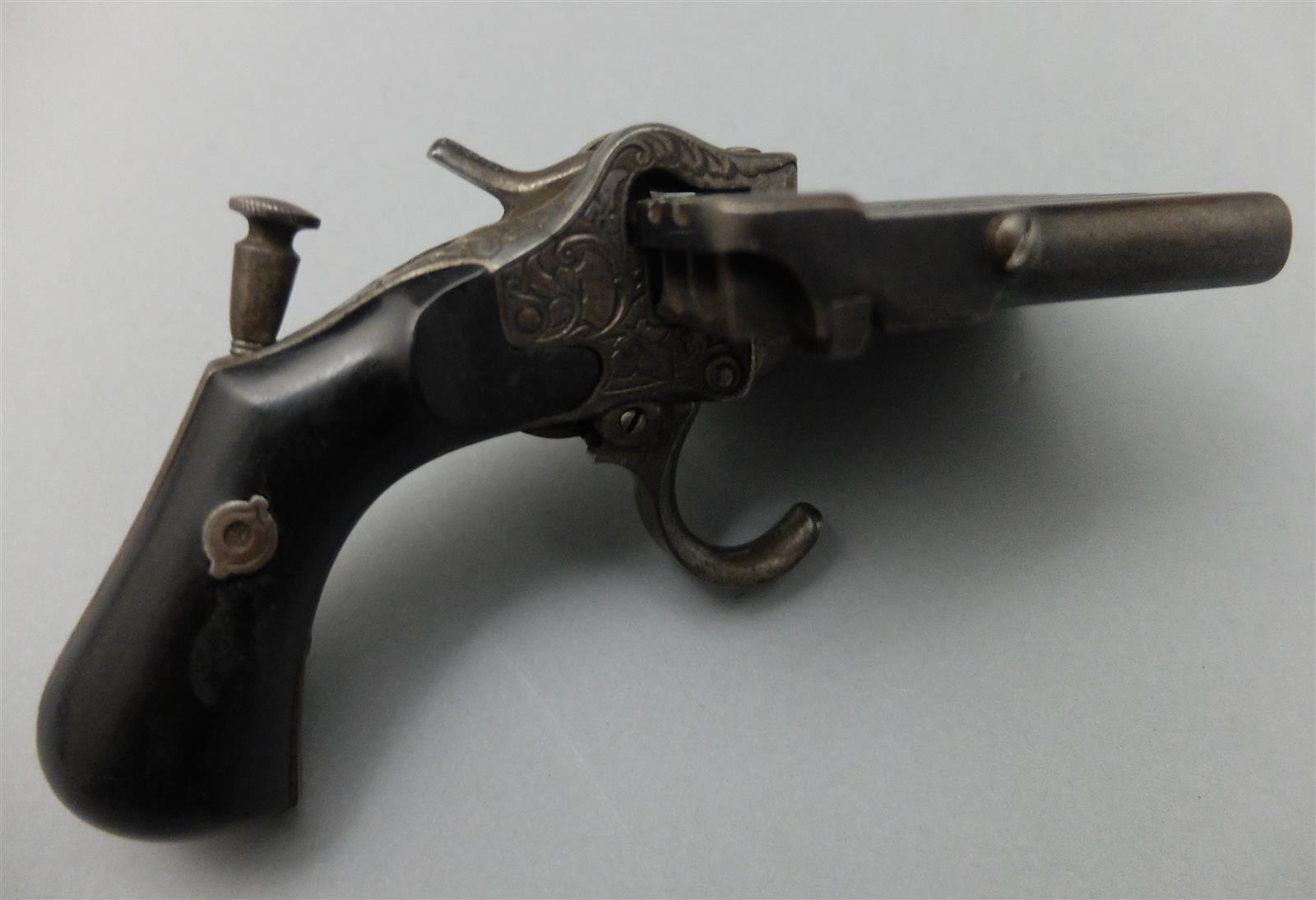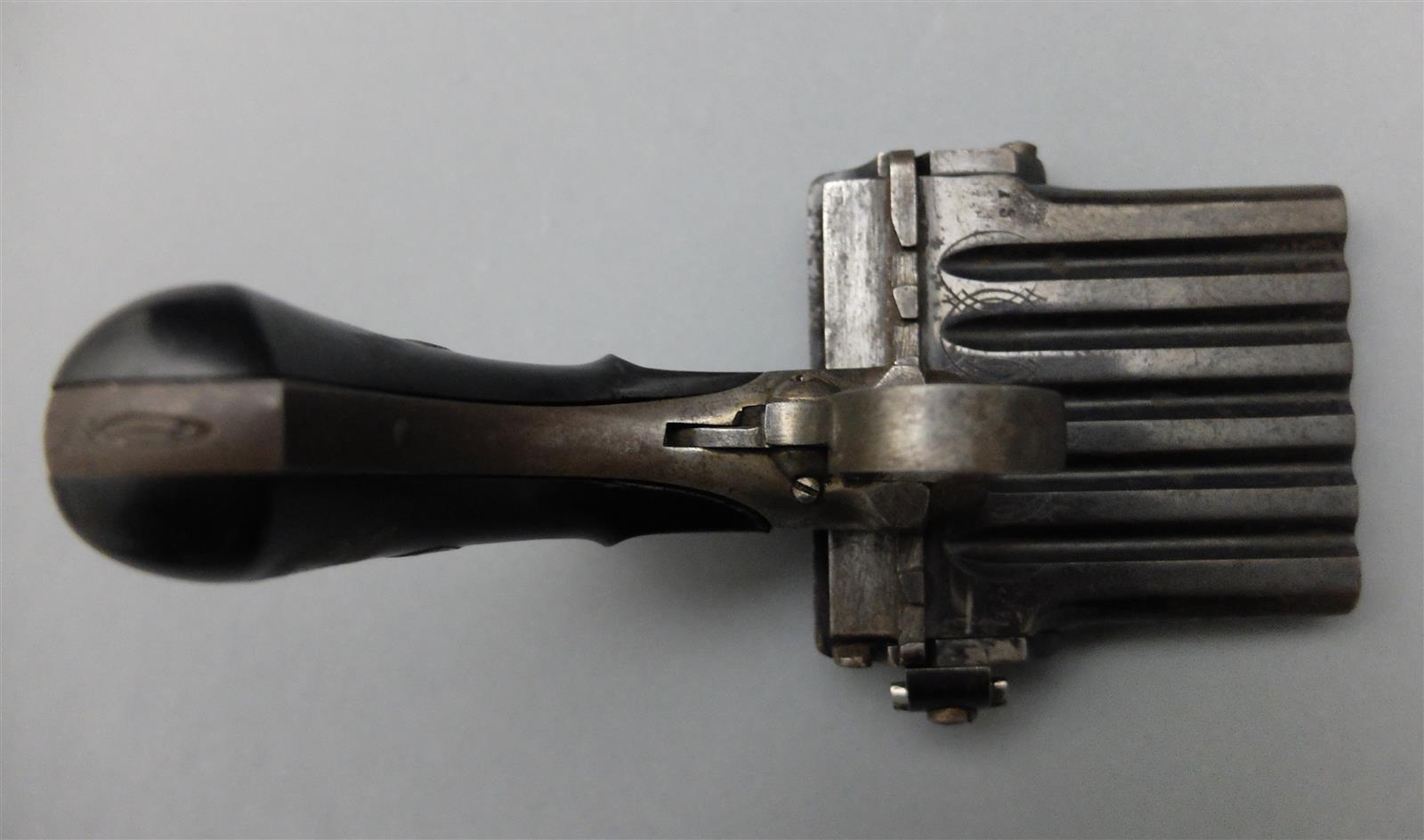 PISTOLET A BROCHE TYPE JARRE DIT HARMONICA, calibre 7 mm, 6 coups, double action, carcasse à décor gravé de feuillage, barillet plat et en longueur, plaquettes de la poignée en ébène, tige d'extraction vissée sur le dessus de la crosse, mécanisme semblant fonctionnel, longueur : 14 cm, vers 1860, BE.