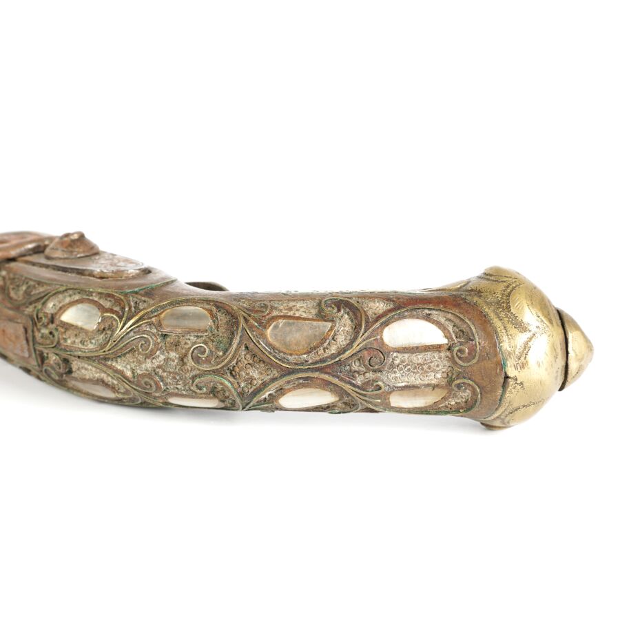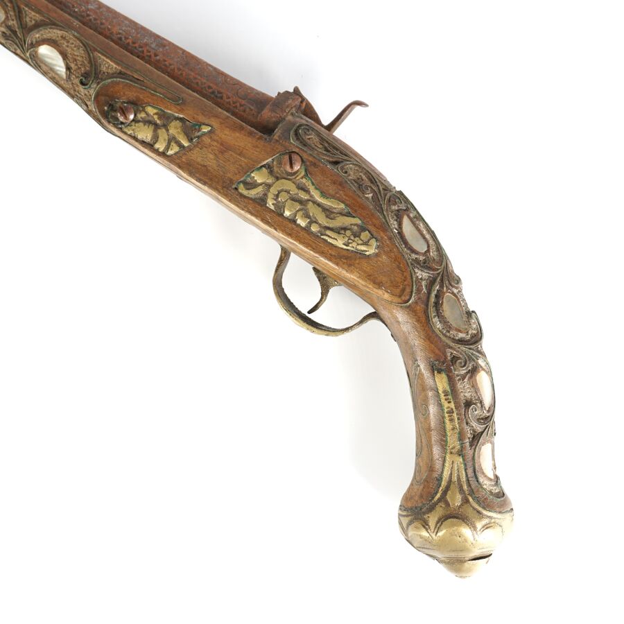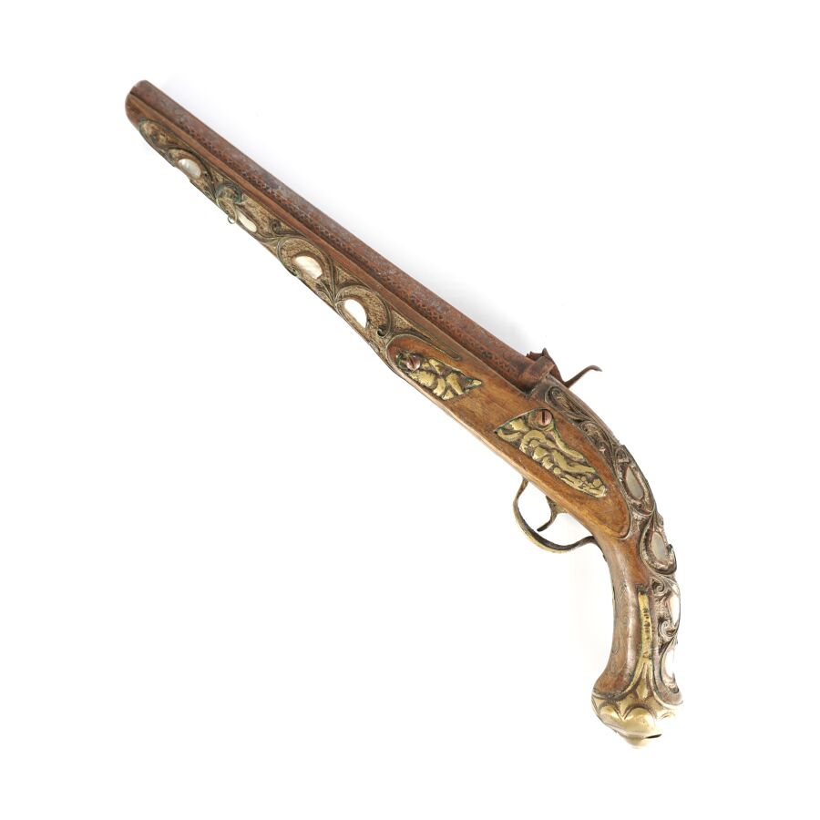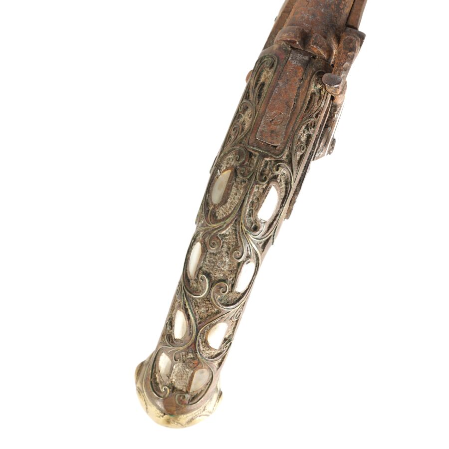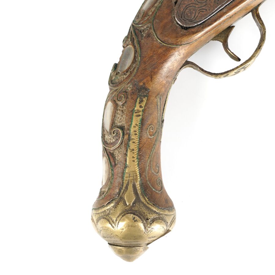 PISTOLET A PERCUSSION POUR L'ORIENT, platine à percussion avec de légères gravures, canon rond piqué de 27 cm, garnitures en nacre, monture en noyer sculpté incrustré de plaquettes de nacre et de filets en laiton, fonctionnement à revoir, longueur : 45 cm, EM.