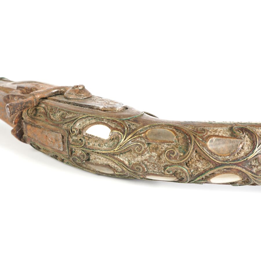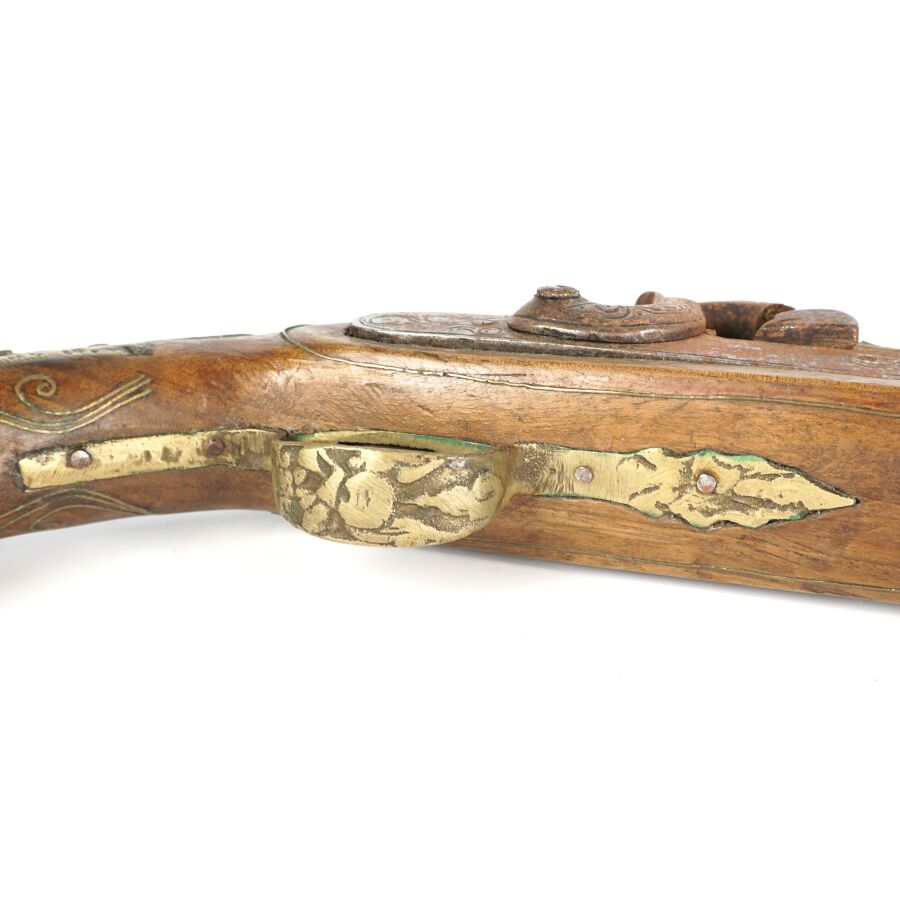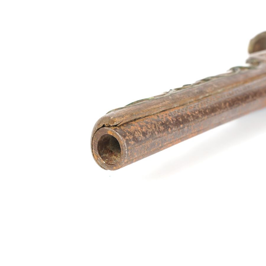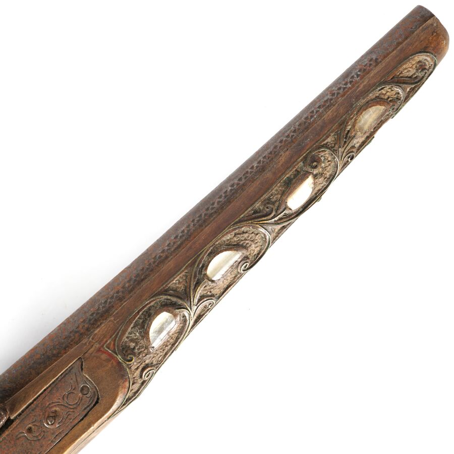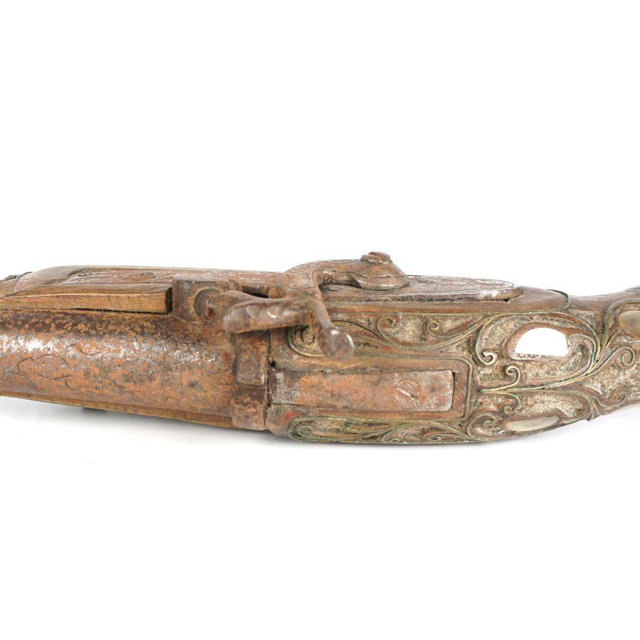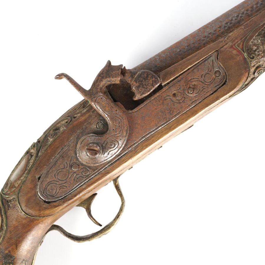PISTOLET A PERCUSSION POUR L'ORIENT, platine à percussion avec de légères gravures, canon rond piqué de 27 cm, garnitures en nacre, monture en noyer sculpté incrustré de plaquettes de nacre et de filets en laiton, fonctionnement à revoir, longueur : 45 cm, EM.