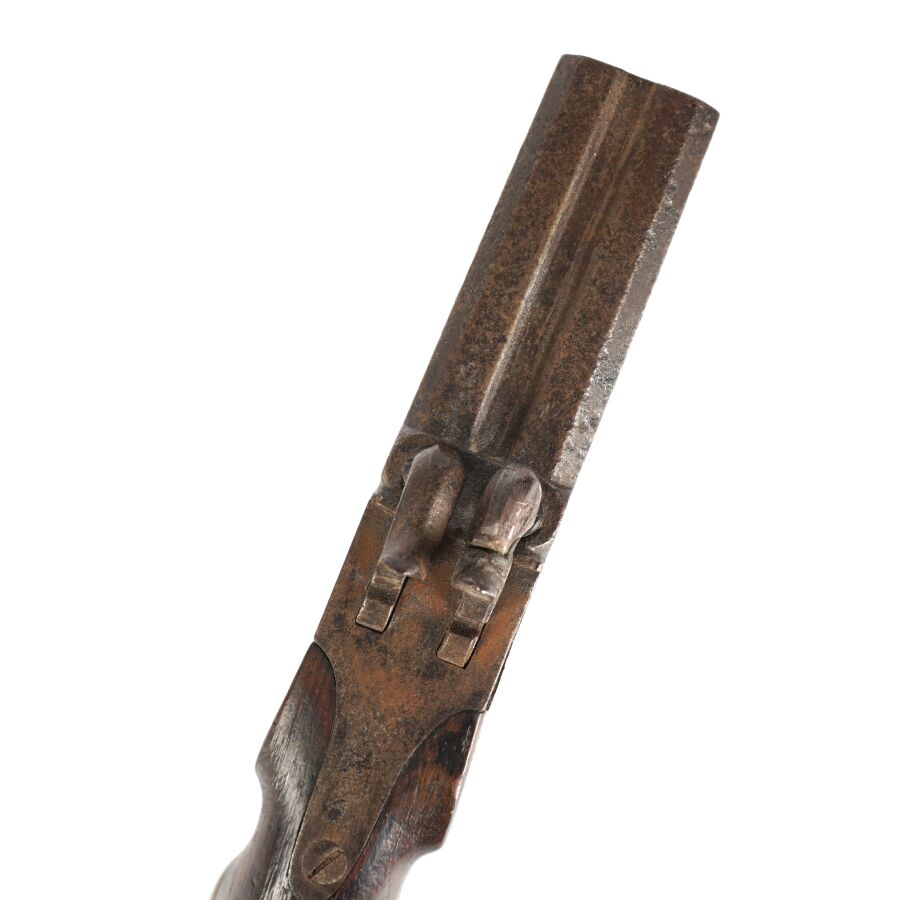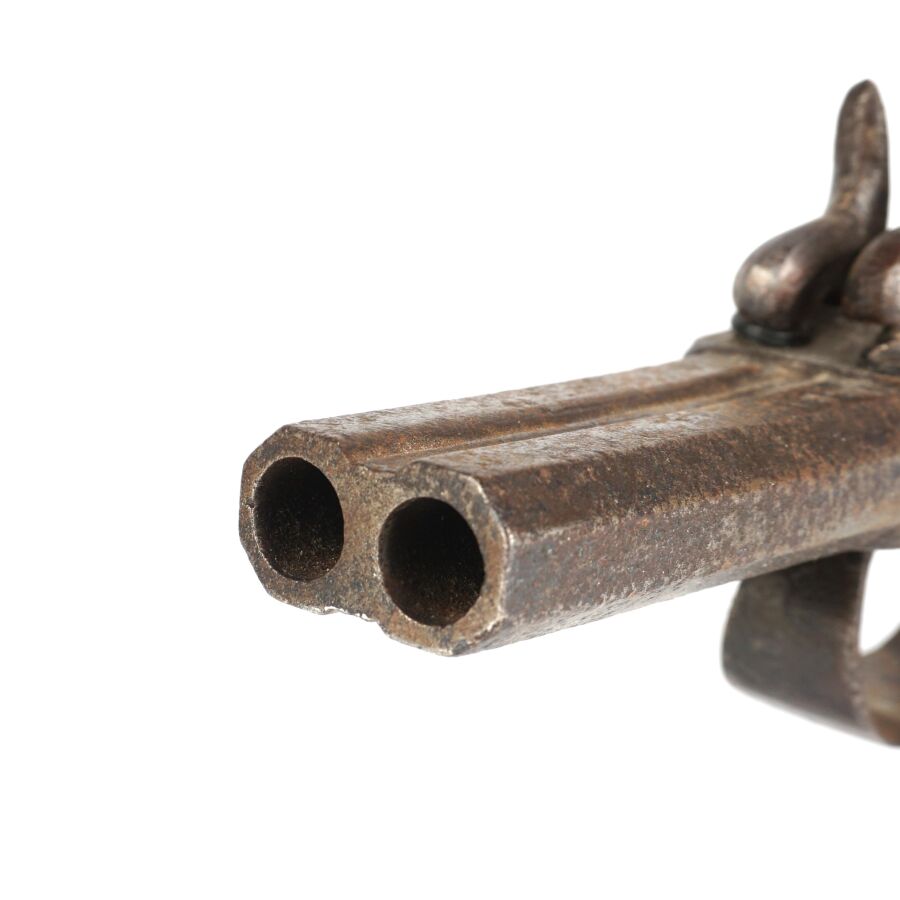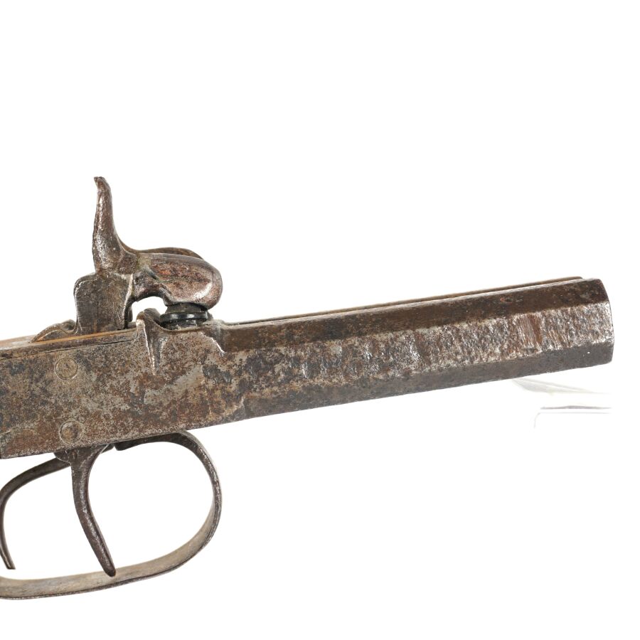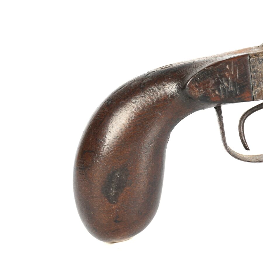 PISTOLET COUP DE POING A DEUX CANONS EN TABLE, platines à coffre à percussion piquées, canons à pans de 7 cm à balles forcées fortement piqués, crosse en noyer en forme de poire (coups), mécanisme semblant fonctionnel, réparation d'un chien, longueur totale : 19 cm, vers 1840, ABE.
