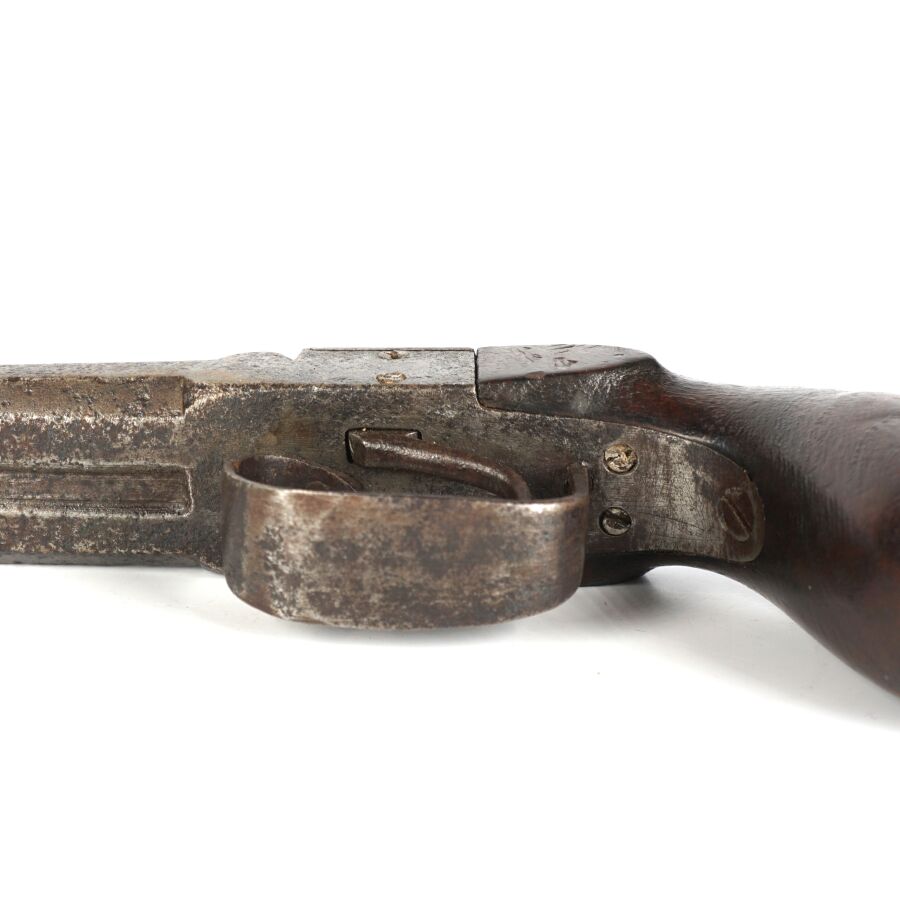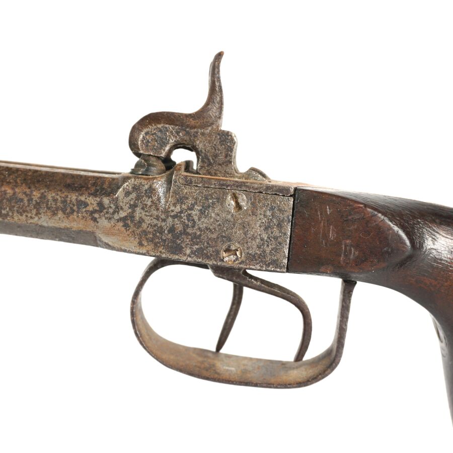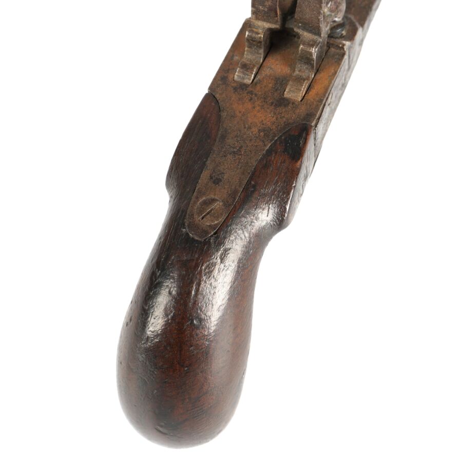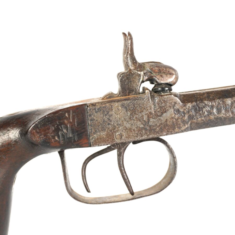 PISTOLET COUP DE POING A DEUX CANONS EN TABLE, platines à coffre à percussion piquées, canons à pans de 7 cm à balles forcées fortement piqués, crosse en noyer en forme de poire (coups), mécanisme semblant fonctionnel, réparation d'un chien, longueur totale : 19 cm, vers 1840, ABE.
