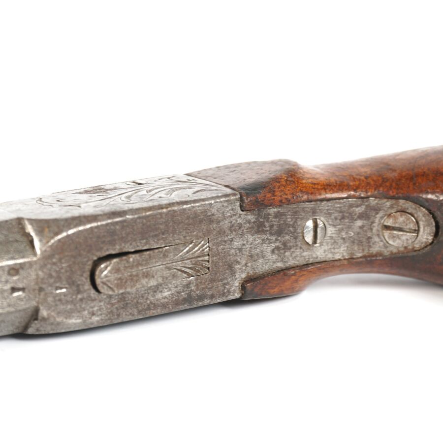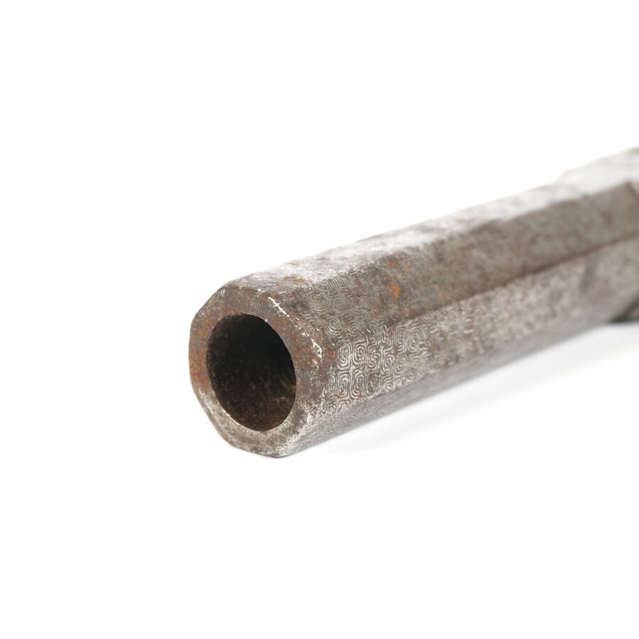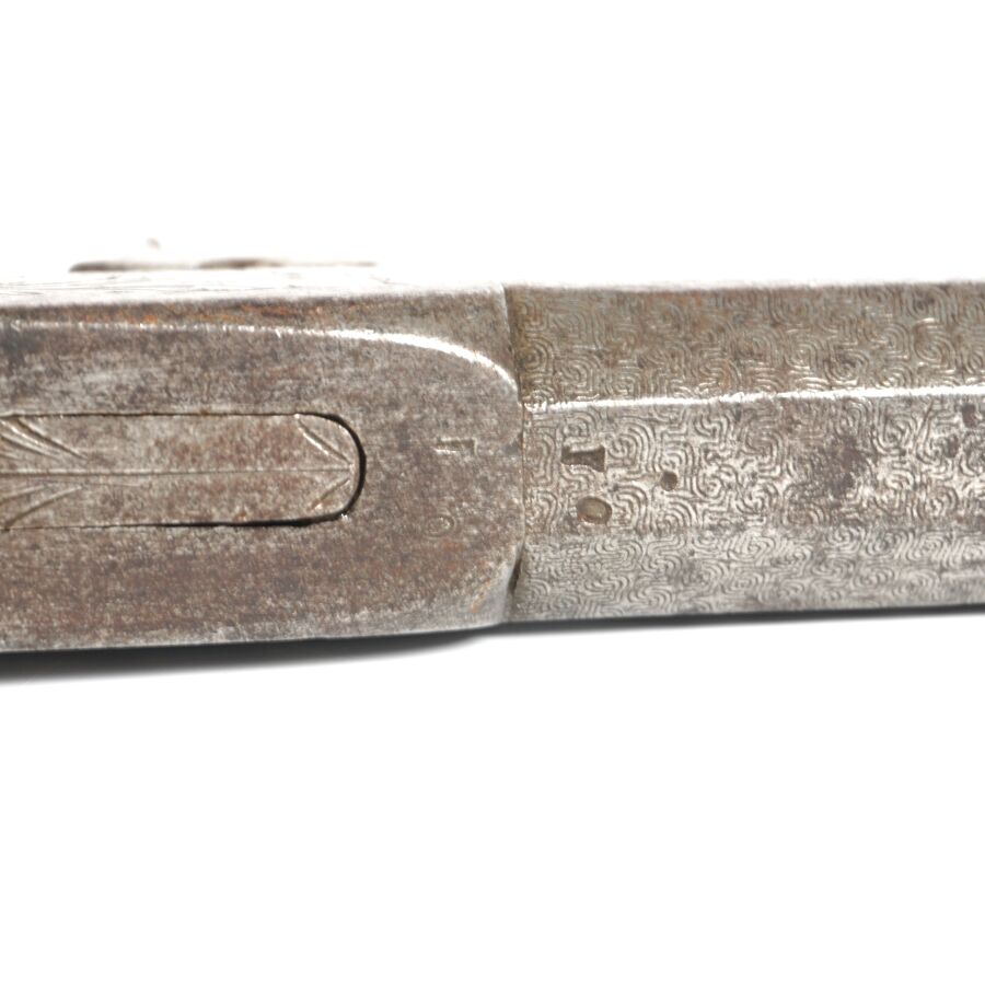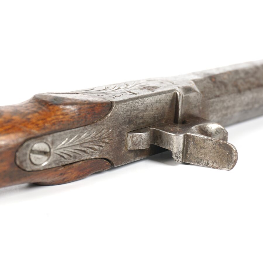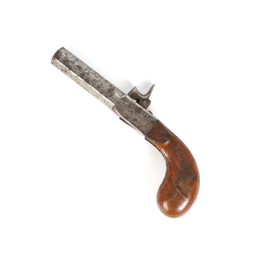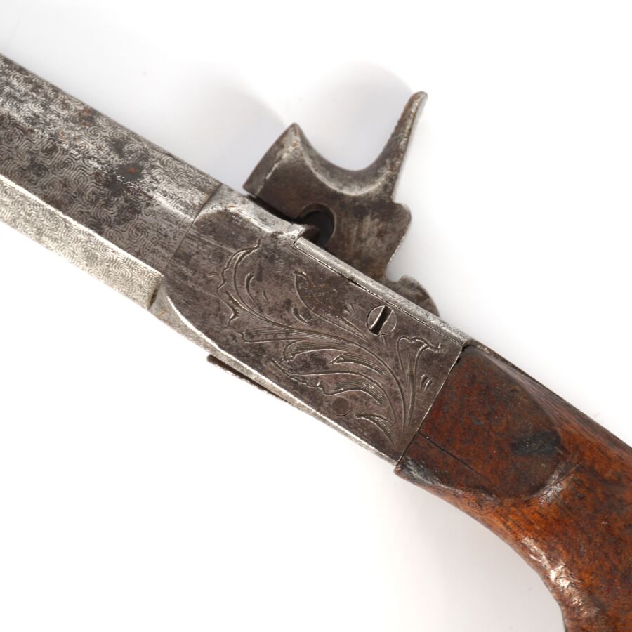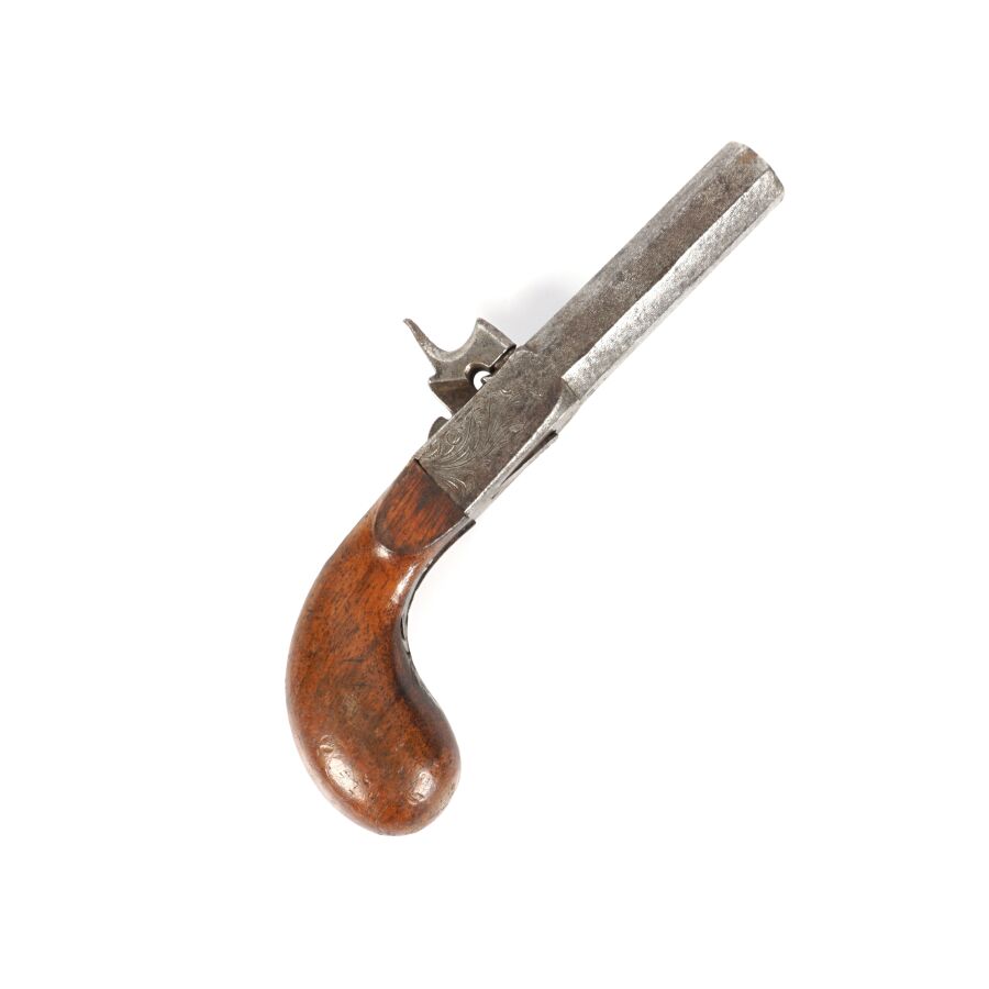 PISTOLET COUP DE POING A PERCUSSION A COFFRE A BALLE FORCEE, platine à percussion à coffre avec de légères gravures, canon rayé à pans damassé à balle forcée de 7 cm, détente rentrante, crosse en noyer, mécanisme semblant fonctionnel, longueur : 17,5 cm, vers 1840, BE.