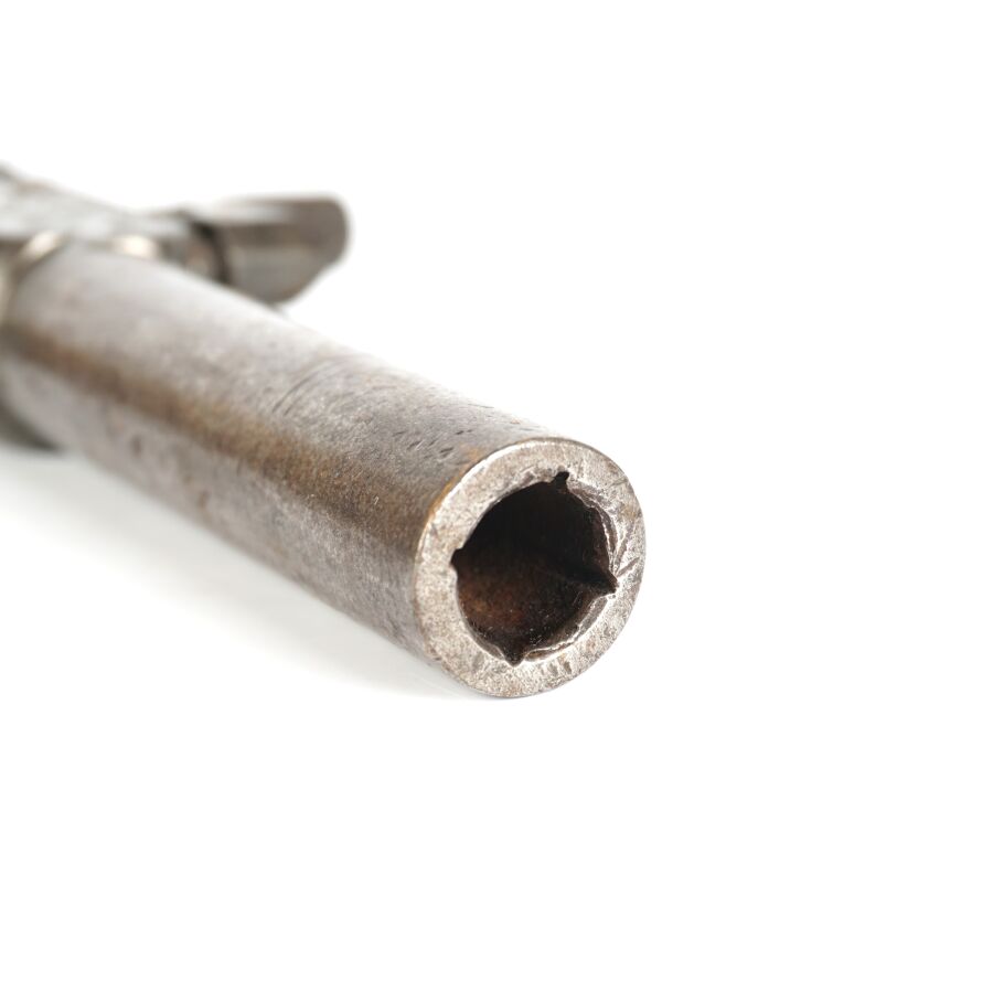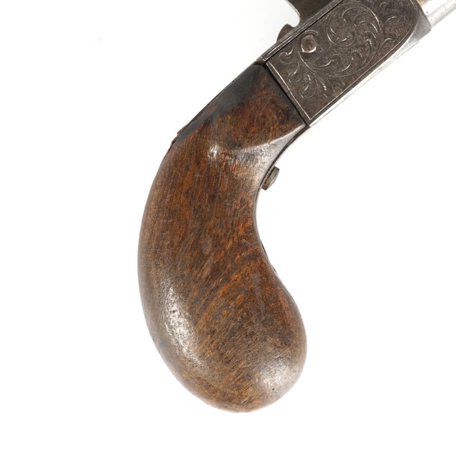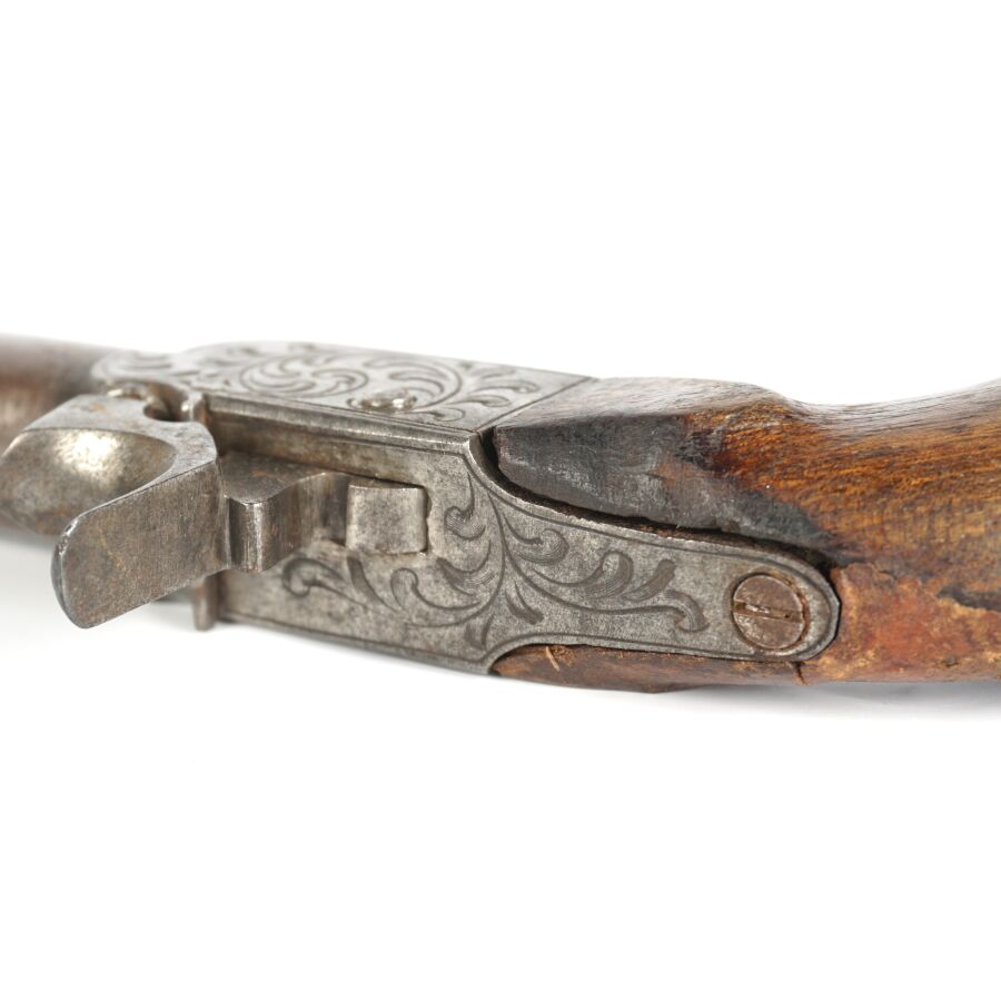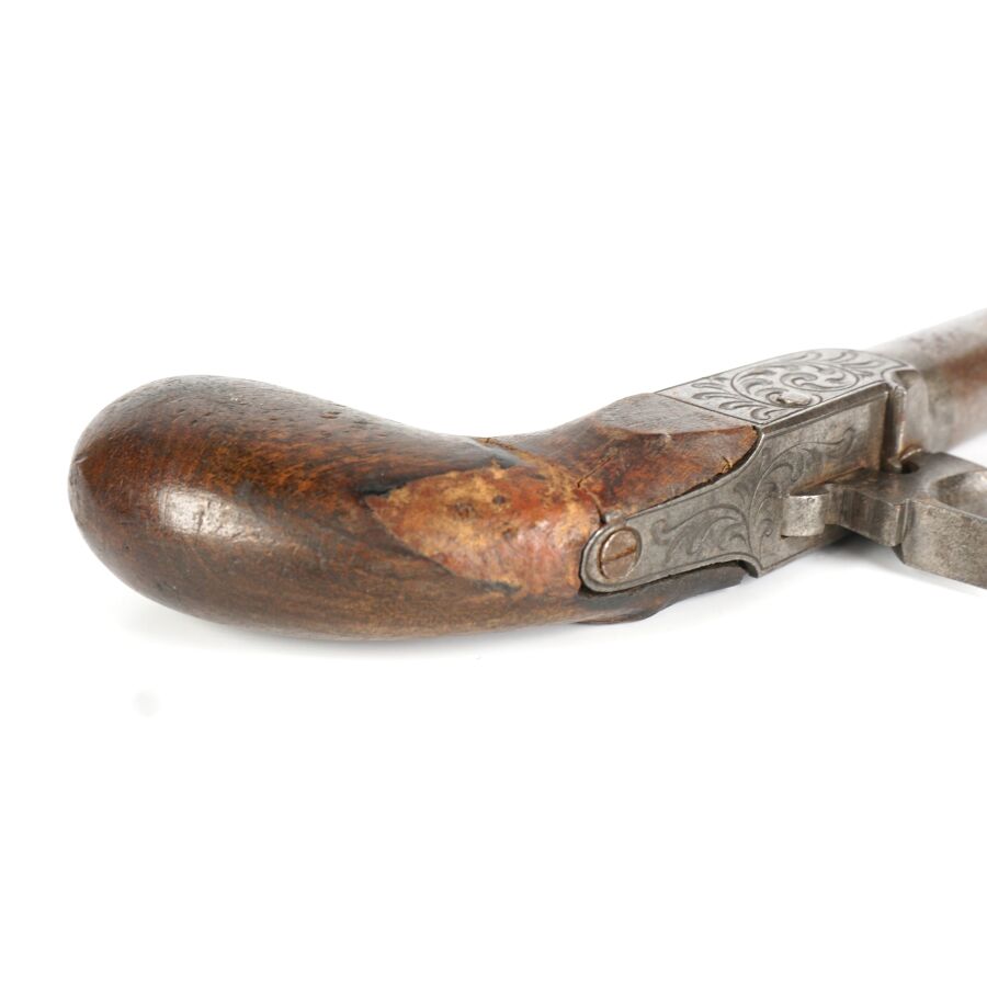 PISTOLET COUP DE POING A PERCUSSION A COFFRE A BALLE FORCEE, platine à percussion à coffre avec de légères gravures, canon rond rayé à balle forcée de 7 cm, détente rentrante, crosse en noyer, mécanisme semblant fonctionnel, longueur : 17 cm, vers 1840, BE.