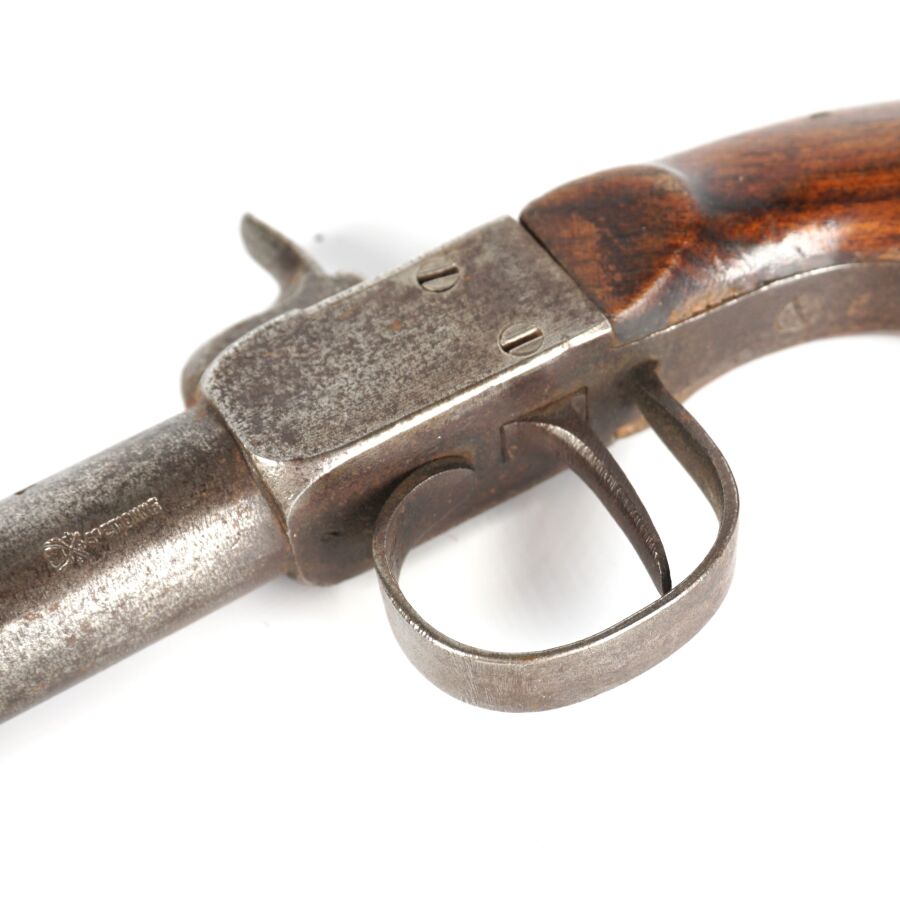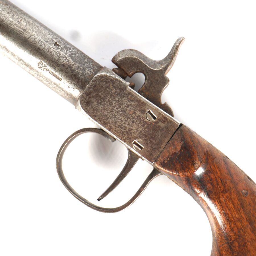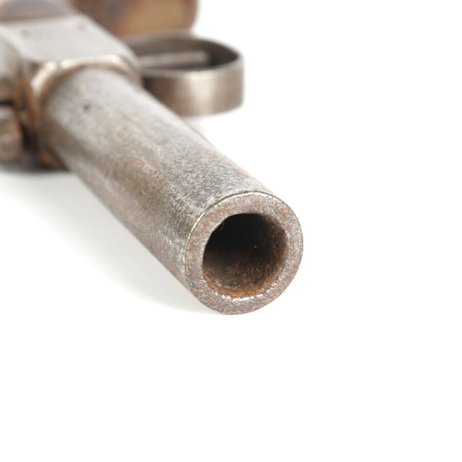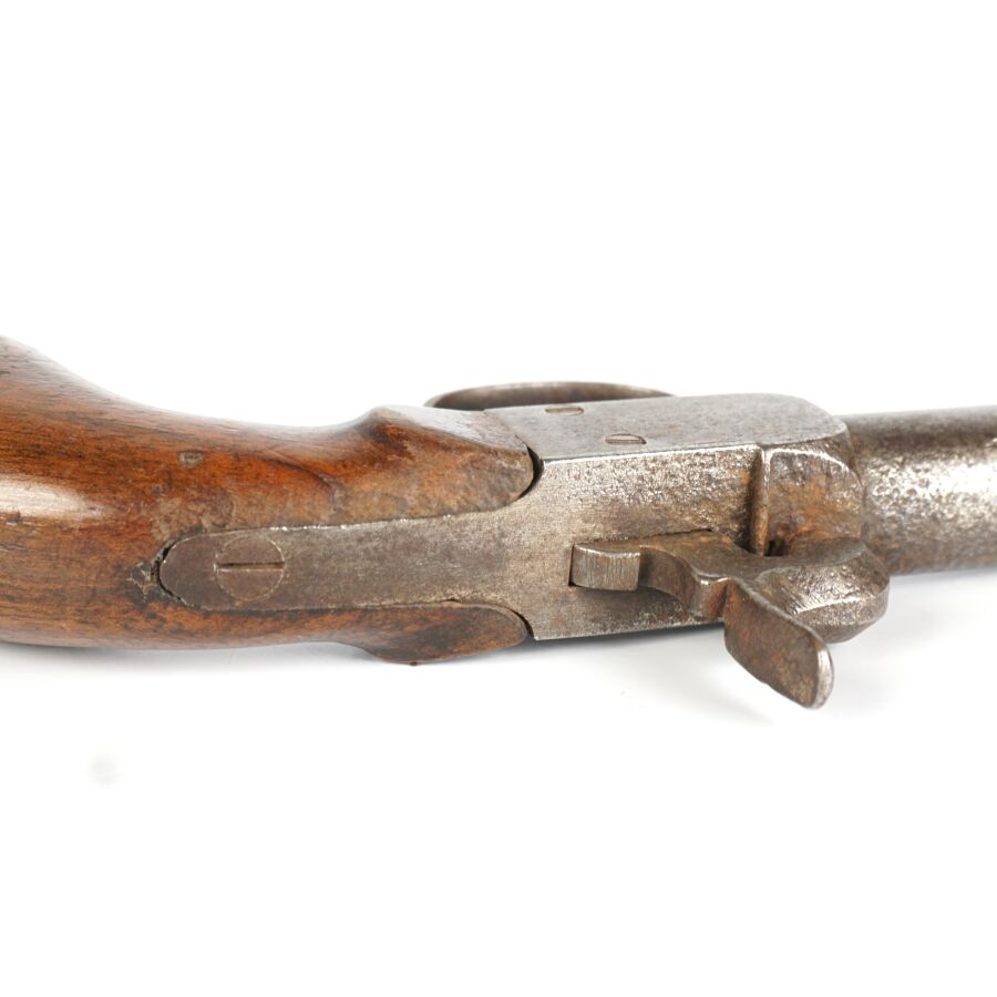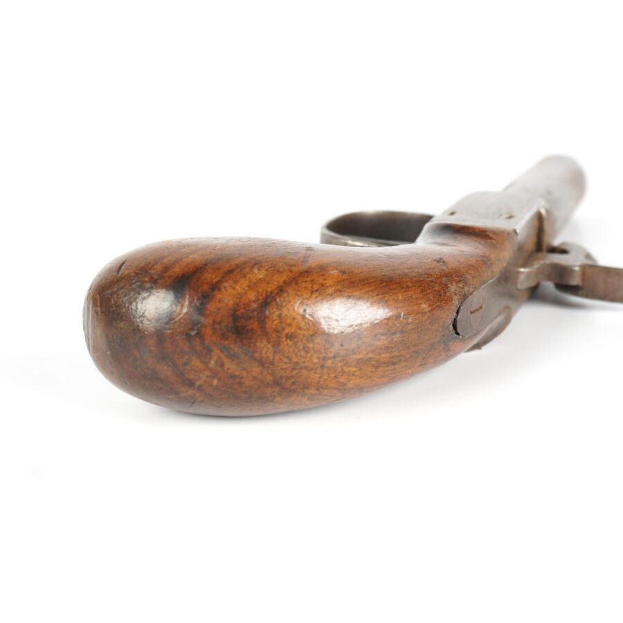 PISTOLET COUP DE POING A PERCUSSION A COFFRE, platine à percussion à coffre, canon rond rayé de 6,8 cm, crosse en noyer, mécanisme semblant fonctionnel, longueur : 17 cm, vers 1840, BE.