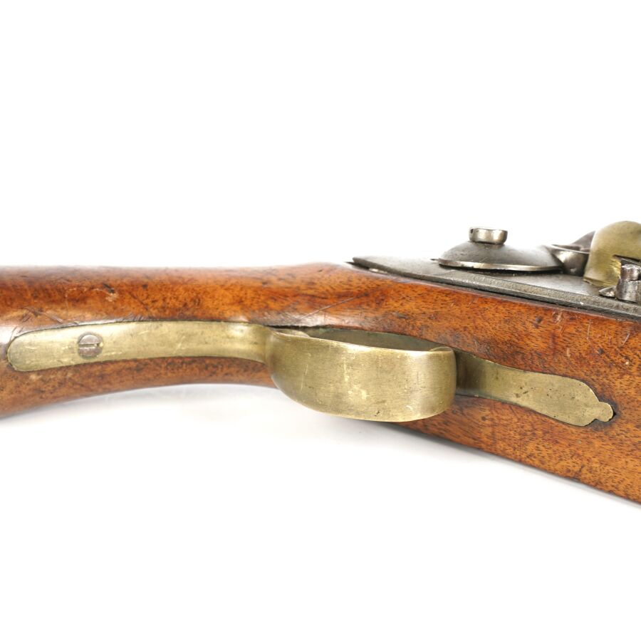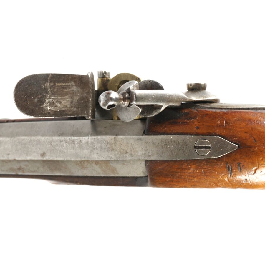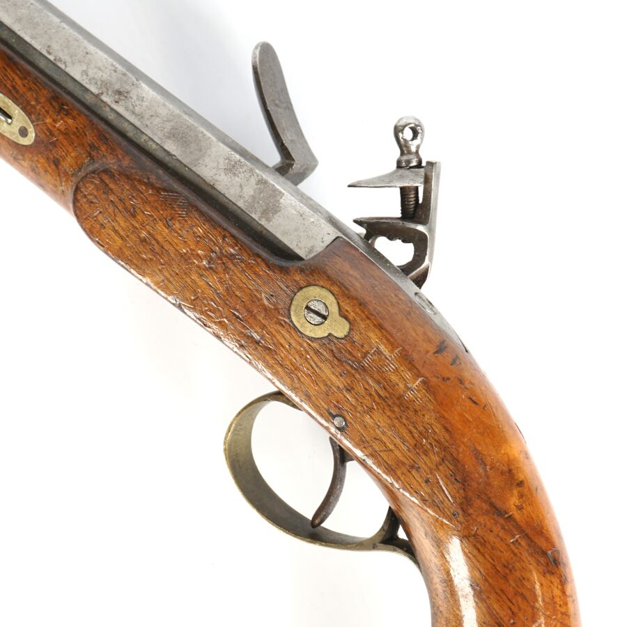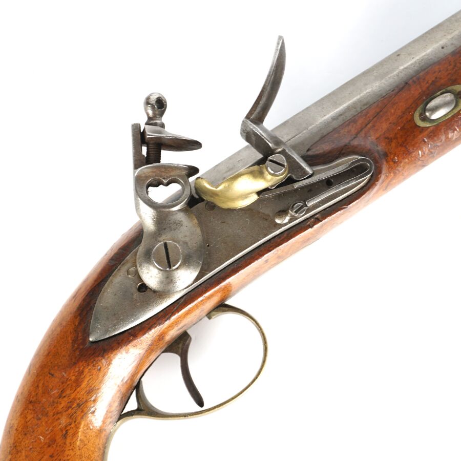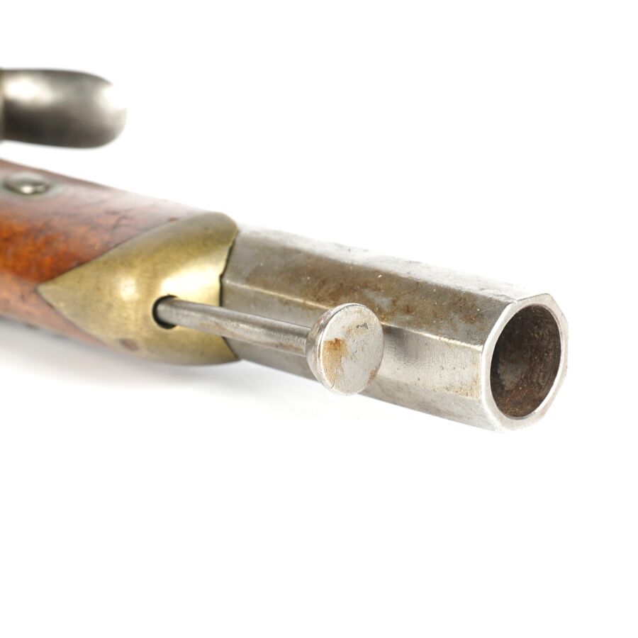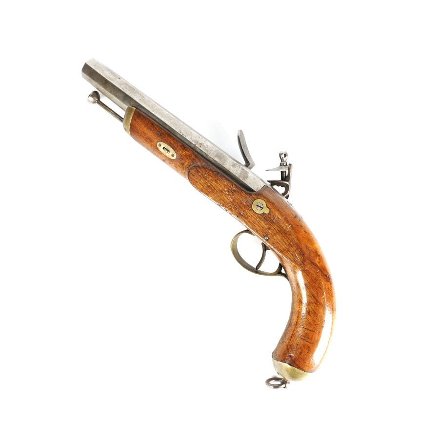 PISTOLET DE CAVALERIE A SILEX, platine et chien à corps ronds, canon à pans de 21,5 cm, garnitures laiton, monture en noyer (petite restauration), anneau de calotte en fer, baguette en fer, mécanisme semblant fonctionnel, longueur : 36 cm, XIXème, BE.