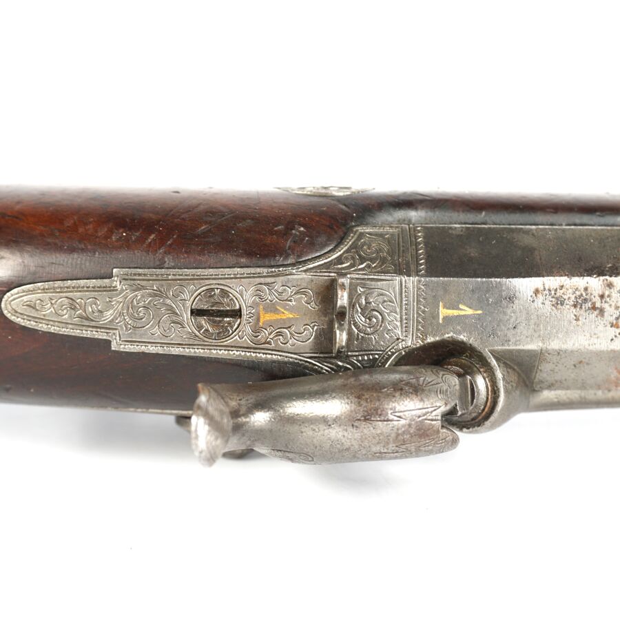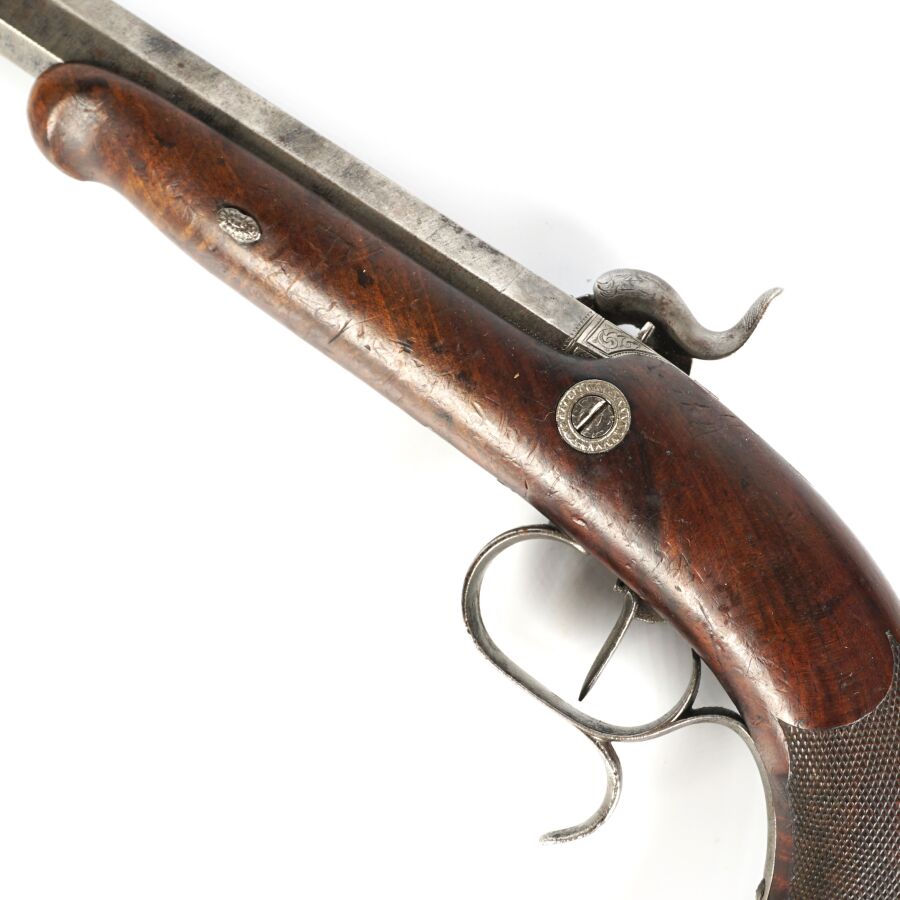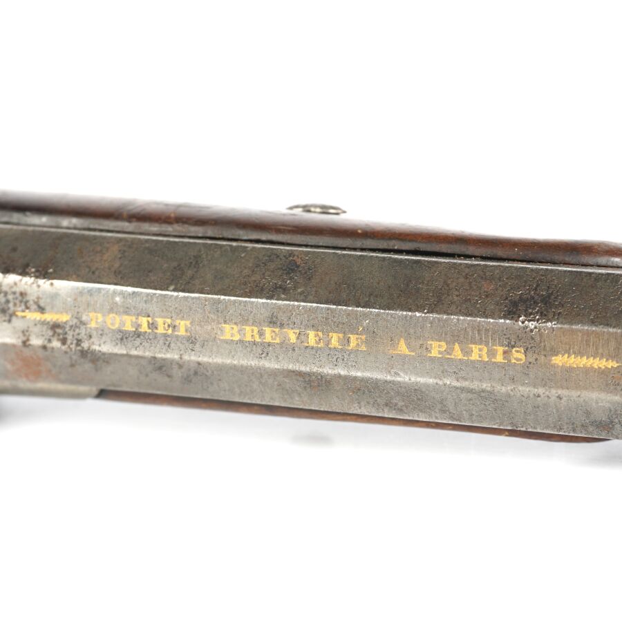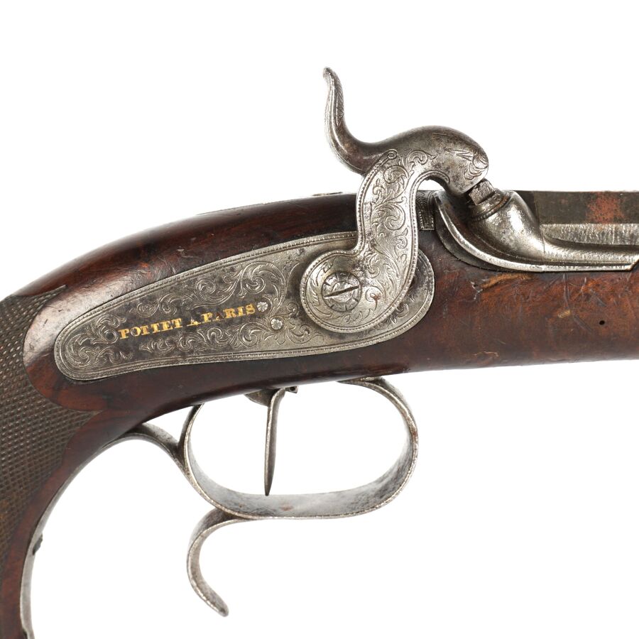 PISTOLET DE TIR OU DE DUEL D'UNE PAIRE, calibre 45, platine à percussion et chien corps rond à décor gravé de rinceaux feuillagés, platine marquée en lettres d'or " POTTET A PARIS ", canon lourd à pans de 22 cm marqué en lettres d'or sur le pan supérieur " POTTET BREVETE A PARIS " et numéroté " 1 " au tonnerre et sur la queue de culasse, hausse fixe et guidon à queue d'aronde, garnitures en fer, pontet avec repose-doigt, monture en noyer en partie quadrillée avec repose-paume (coups et manque à la base de la calotte), oxydations et piqures sur toutes les parties métalliques, mécanisme semblant fonctionnel, longueur totale : 38 cm, milieu XIXème, BE.