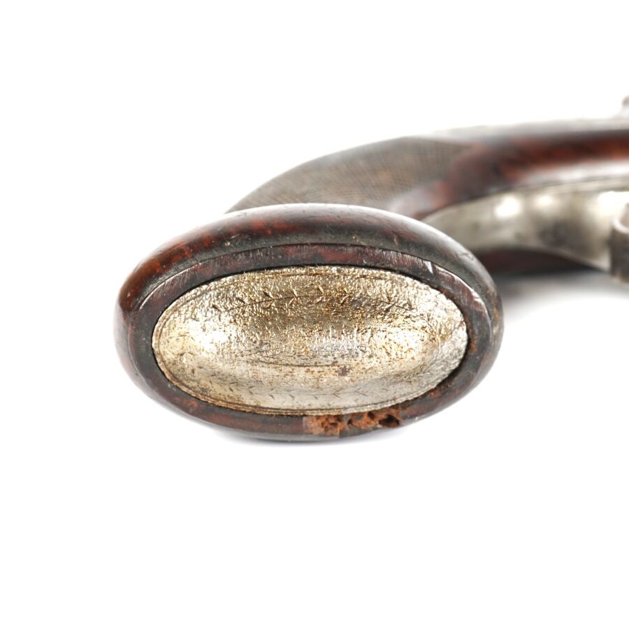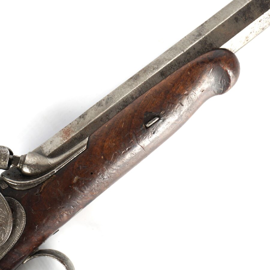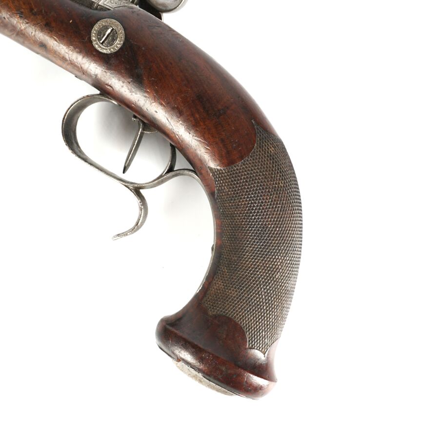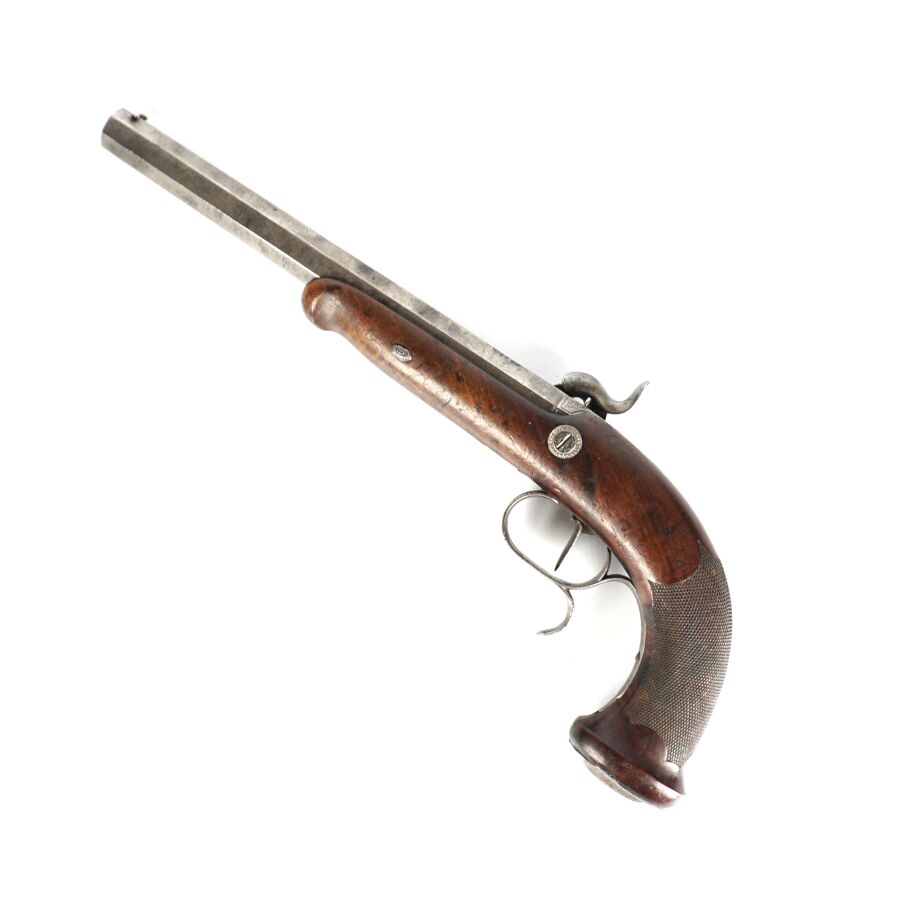 PISTOLET DE TIR OU DE DUEL D'UNE PAIRE, calibre 45, platine à percussion et chien corps rond à décor gravé de rinceaux feuillagés, platine marquée en lettres d'or " POTTET A PARIS ", canon lourd à pans de 22 cm marqué en lettres d'or sur le pan supérieur " POTTET BREVETE A PARIS " et numéroté " 1 " au tonnerre et sur la queue de culasse, hausse fixe et guidon à queue d'aronde, garnitures en fer, pontet avec repose-doigt, monture en noyer en partie quadrillée avec repose-paume (coups et manque à la base de la calotte), oxydations et piqures sur toutes les parties métalliques, mécanisme semblant fonctionnel, longueur totale : 38 cm, milieu XIXème, BE.