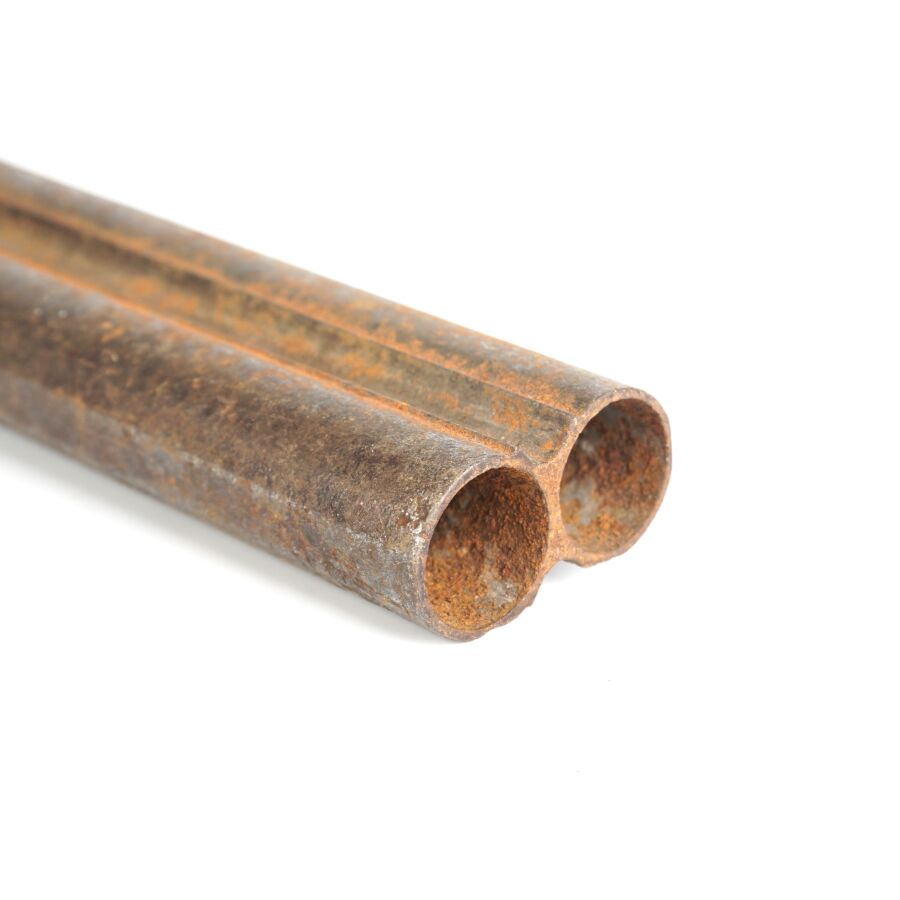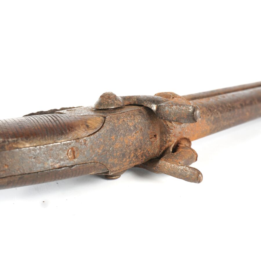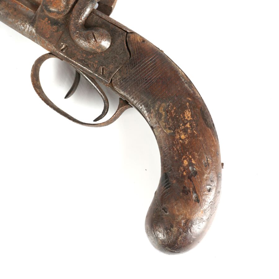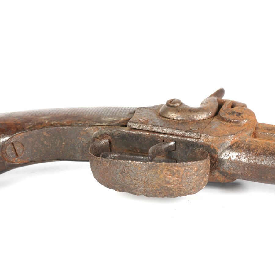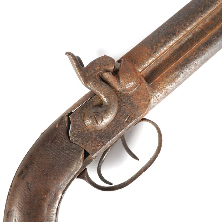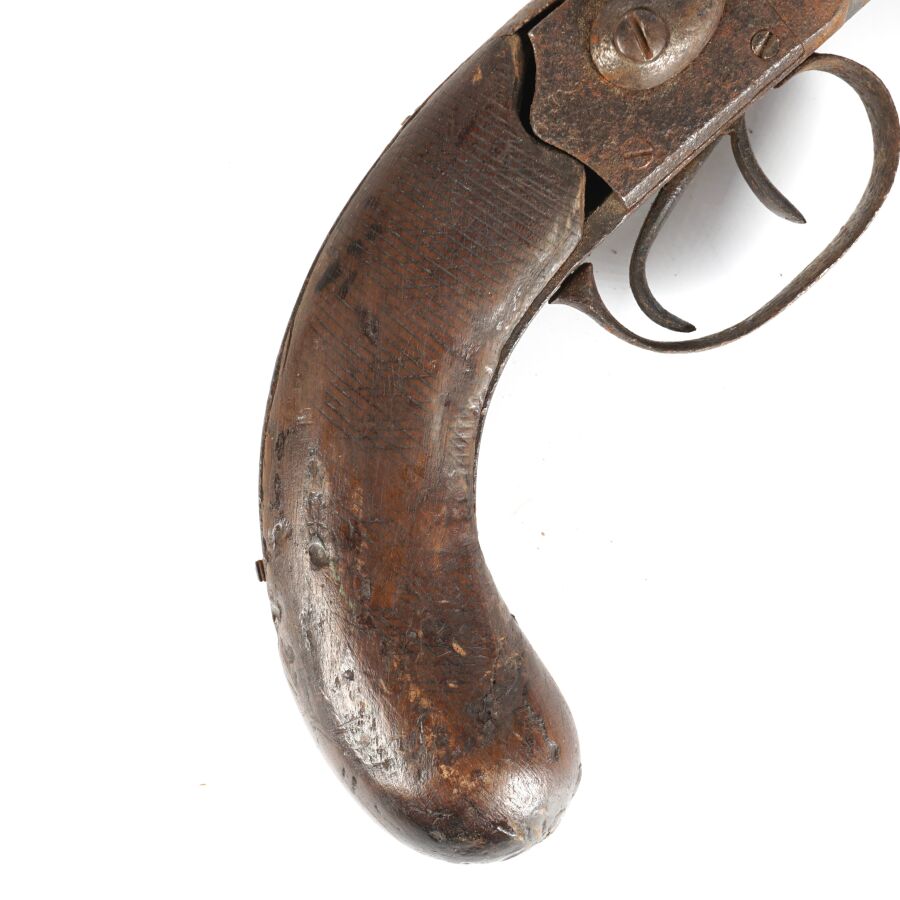 PISTOLET D'OFFICIER A PERCUSSION A DEUX CANONS SUPERPOSES, canons de 27 cm, crosse accidentée en noyer, longueur : 42 cm, vers 1840, DANS L'ETAT.