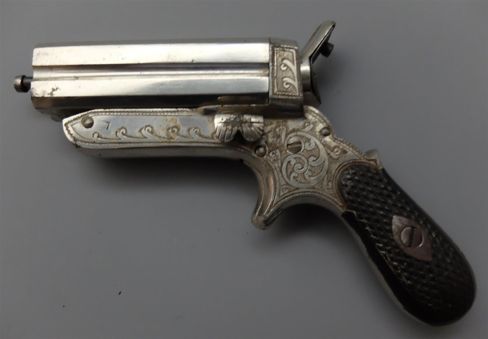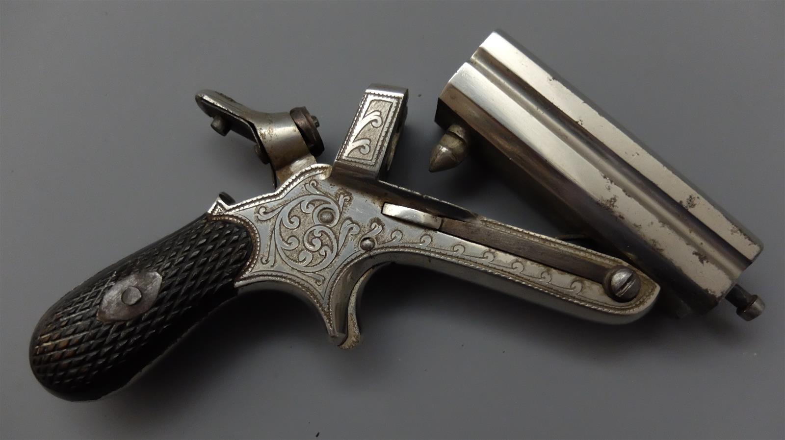 PISTOLET GENRE SHARPS, calibre 36, 4 coups, bloc de 4 canons à pans, chien à percuteur tournant, ouverture par basculement des canons, carcasse nickelée, détente éperon, plaquettes de la poignée quadrillées en bois, mécanisme semblant fonctionnel, longueur : 14 cm, vers 1860, BE.