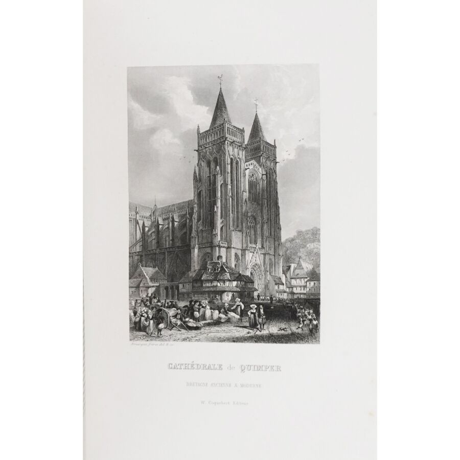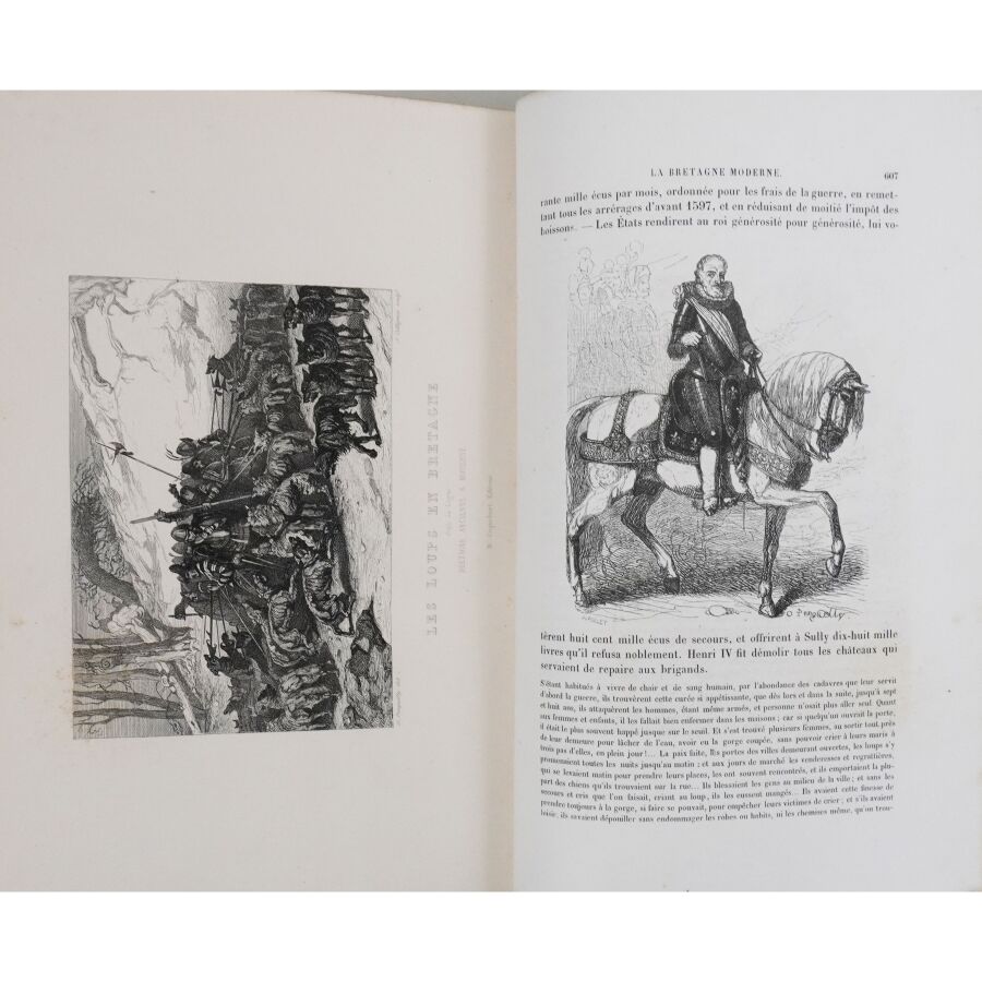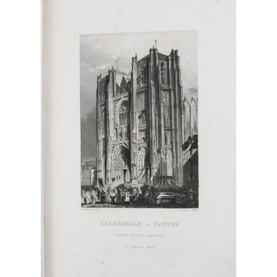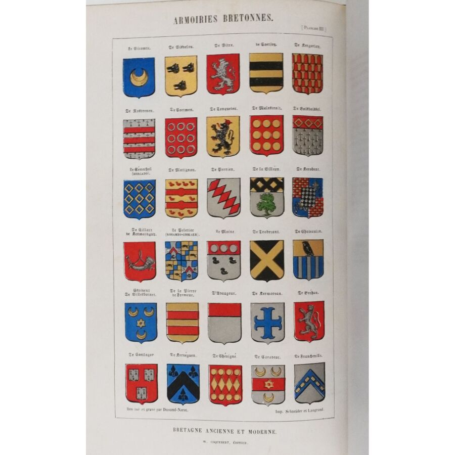 Édition originale en premier tirage illustrée d'un frontispice figurant les armes de Bretagne, d'un portrait de Chateaubriand, de 20 vues et scènes gravées sur acier, 10 planches de costumes en couleurs, d'une planche de monnaies, de 6 planches de blasons en chromolithographie, de 2 cartes en couleurs, ainsi que de près de 200 figures in-texte gravées sur bois.