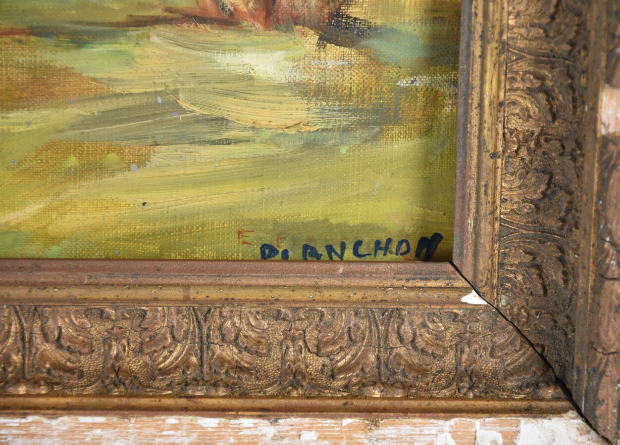 PLANCHON (XX- XXIe), "Paysage arboré", huile sur toile signée en bas à droite, 46 x 55 cm. (traces d'usure)