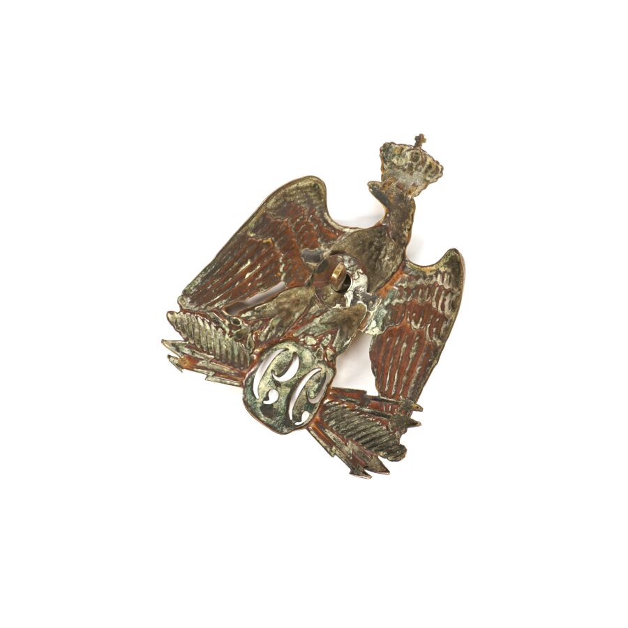 PLAQUE DE SHAKO DU 99ème REGIMENT D'INFANTERIE DE LIGNE SECOND EMPIRE MODELE 1860, en laiton estampé en relief et découpé, aigle couronné sur fuseau de Jupiter et globe au chiffre " 99 ", crochet de fixation au dos, 12,2 x 10,4 cm, TBE.