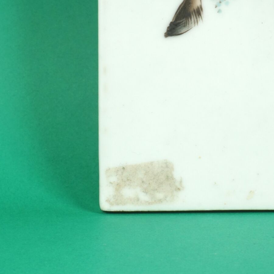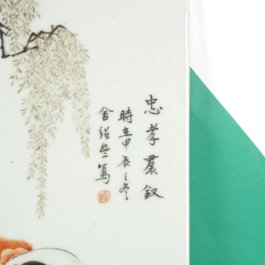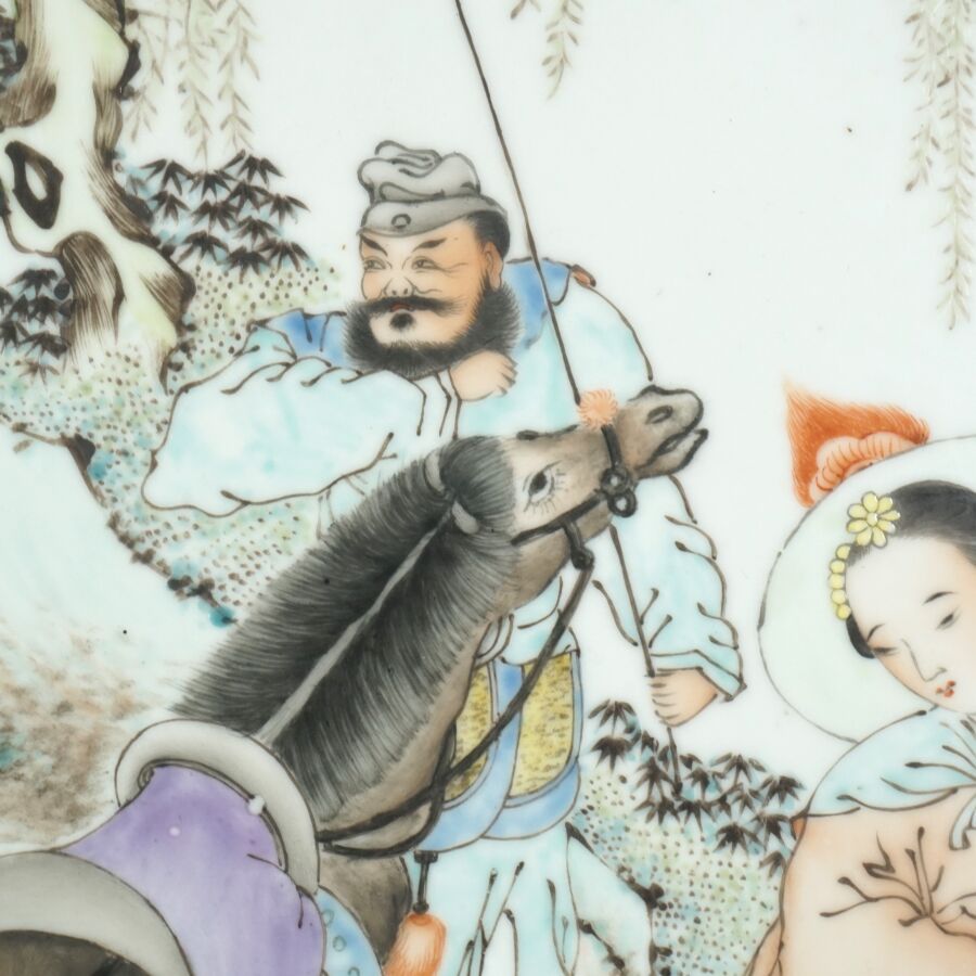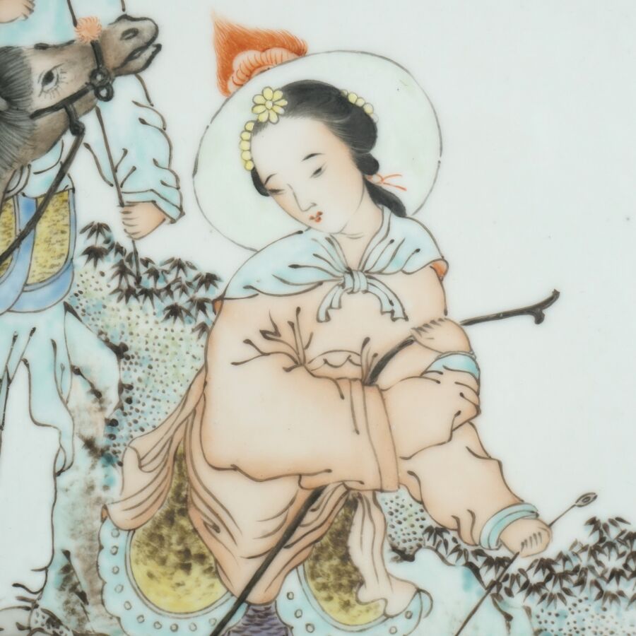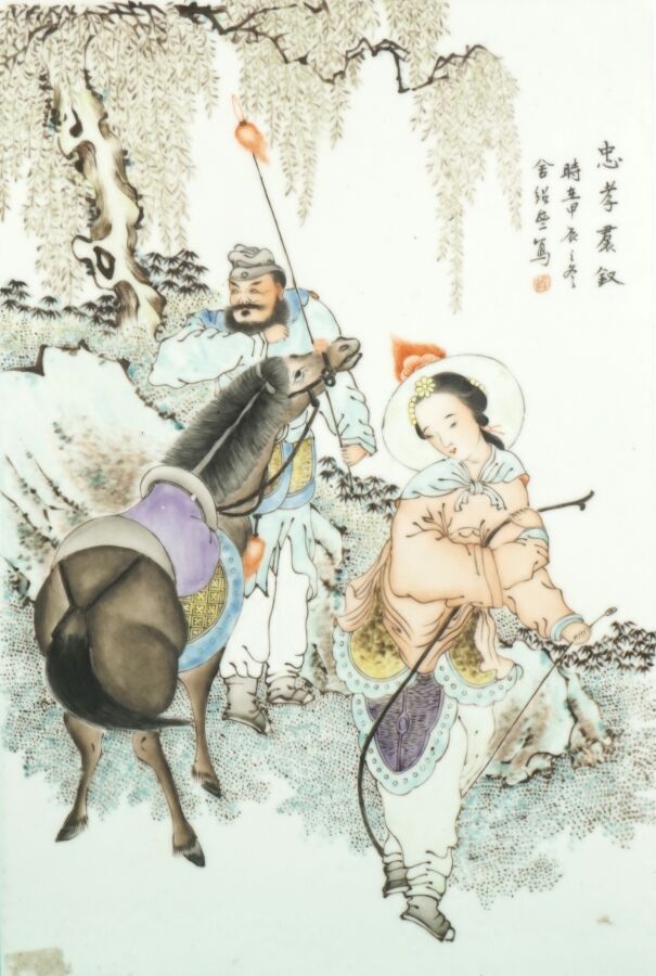 Plaque en porcelaine et émaux polychromes à décor d'un cavalier accompagné d'une jeune femme, poème calligraphié en haut à droite, Chine, période République, Dim. 38.5 x 25.5 (petits éclats en bordure).