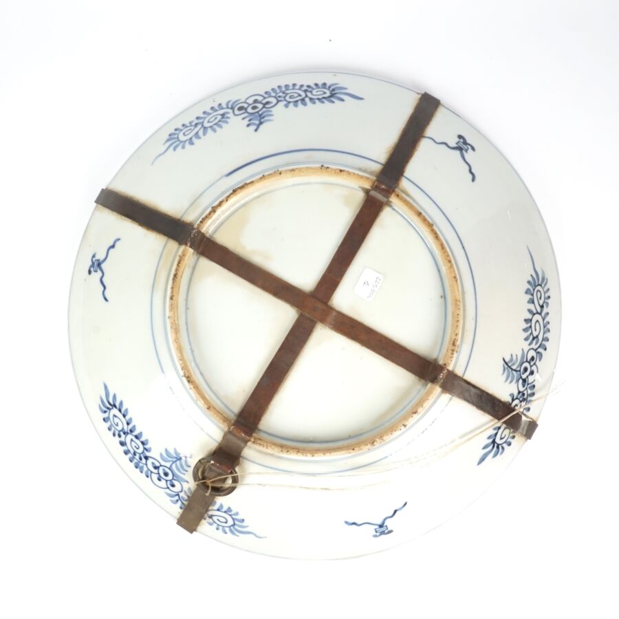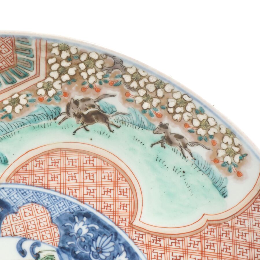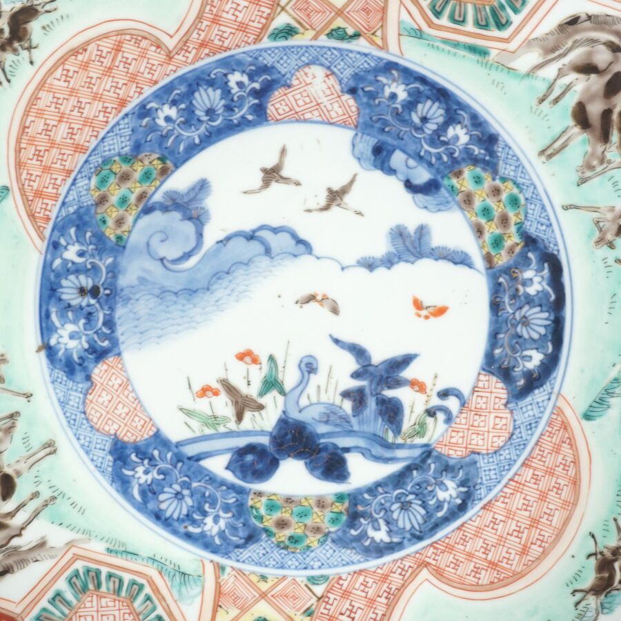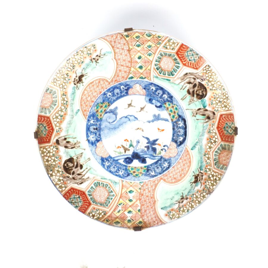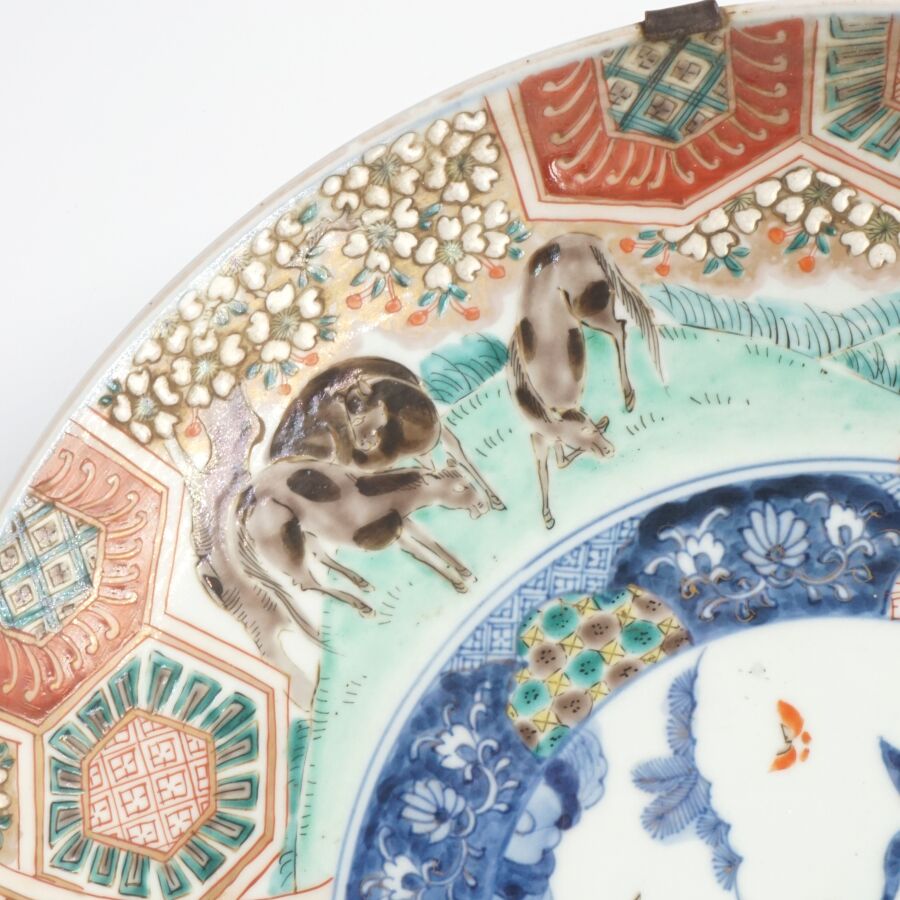 Plat circulaire en porcelaine émaillée dite Imari, à décor d'un canard sur un lac, l'aile à motifs de chevaux, Japon, 19ème siècle, D. 40.5 cm.