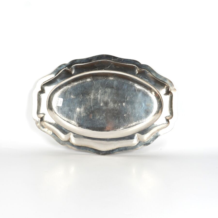 Plat de forme oblongue à bord polylobé en argent, poinçon Minerve 1er titre (950/oo), décor au double filet, Dim. 39.8 x 27.5 cm. Poids brut : 829 g environ.