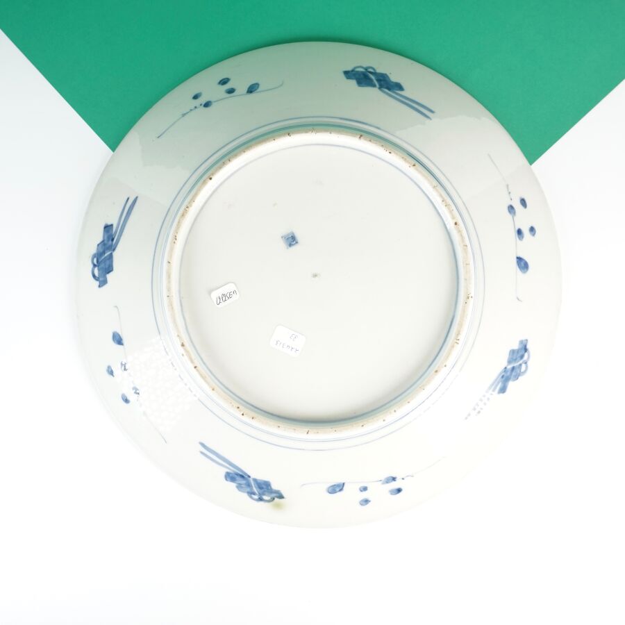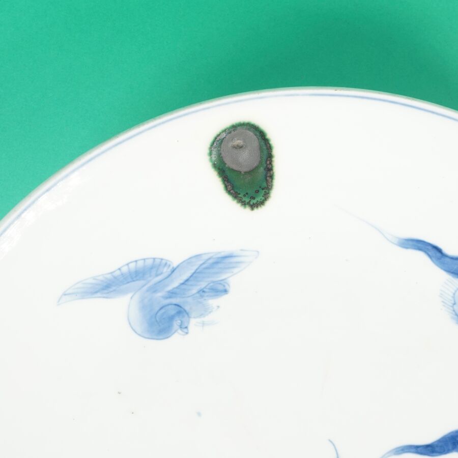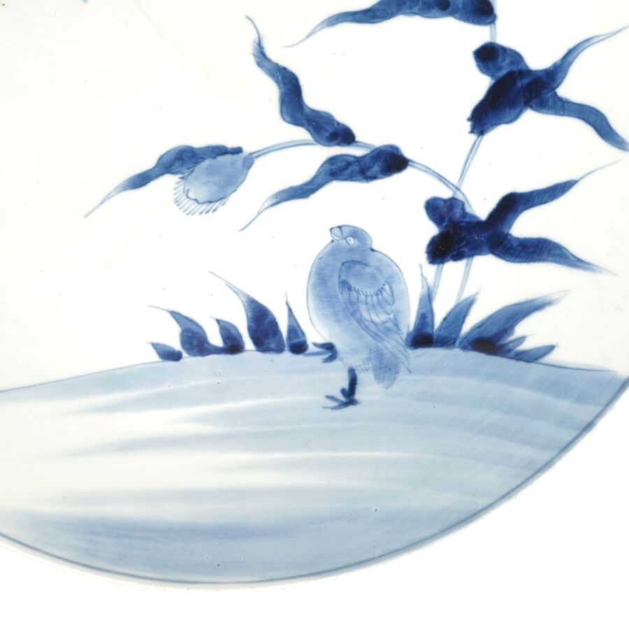 Plat en porcelaine émaillée en bleu et vert sous couverte à décor d'une caille près d'une plante, Japon, Arita, circa 1900, D. 36.5 cm.