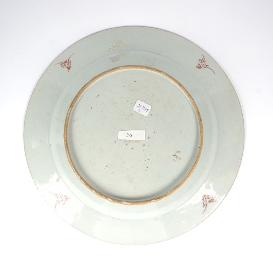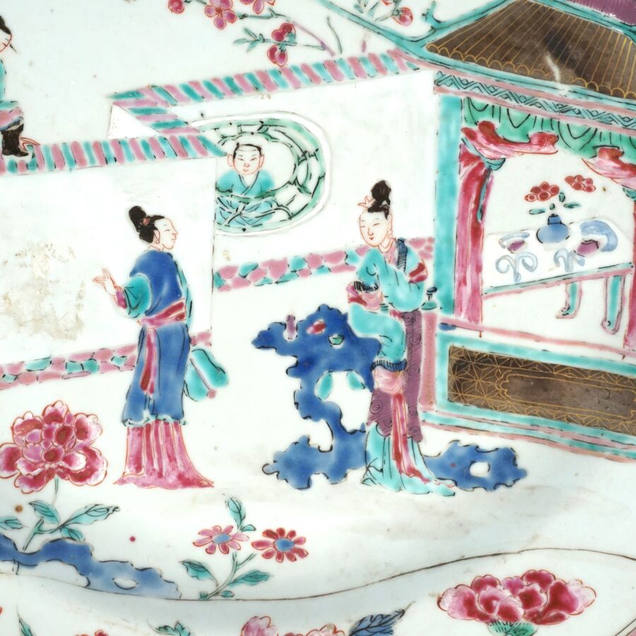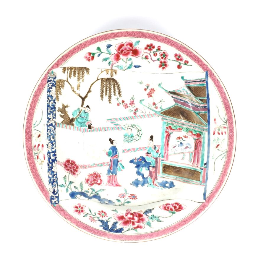 Plat en porcelaine et émaux de la famille rose, finement décoré d'une scène galante se déroulant aux abords d'un pavillon, un saule pleureur et un pivoinier complètent l'ornementation, Chine, Compagnie des Indes, 18ème siècle, D. 32.5 cm (égrenures).