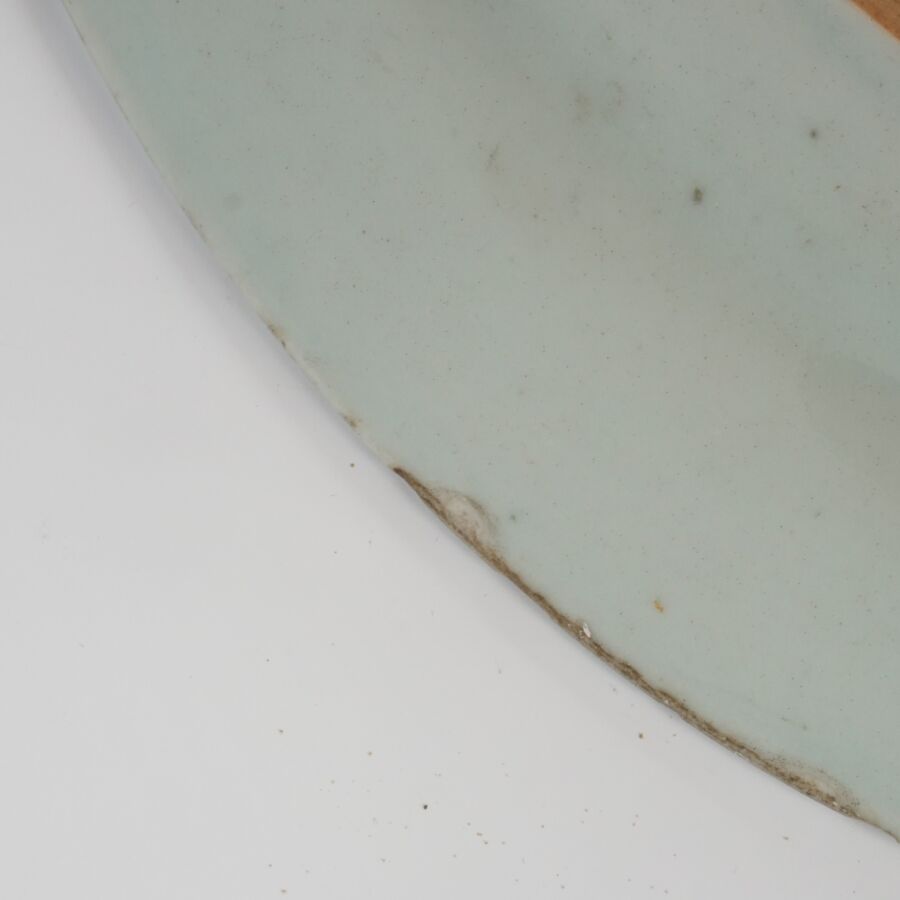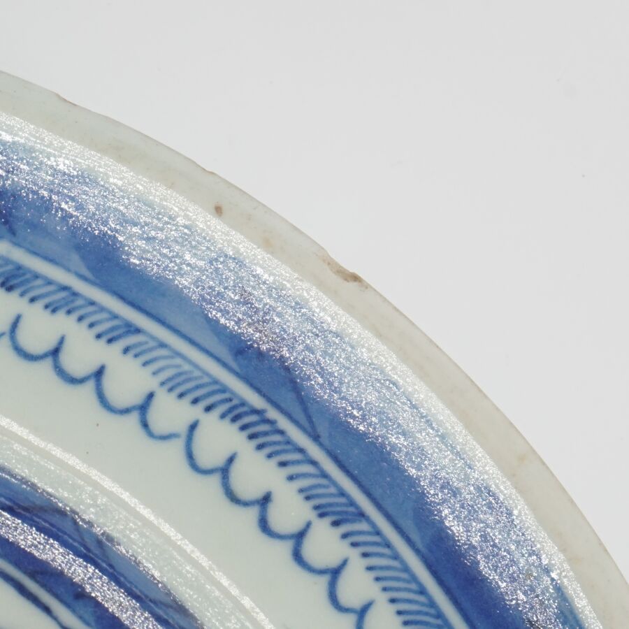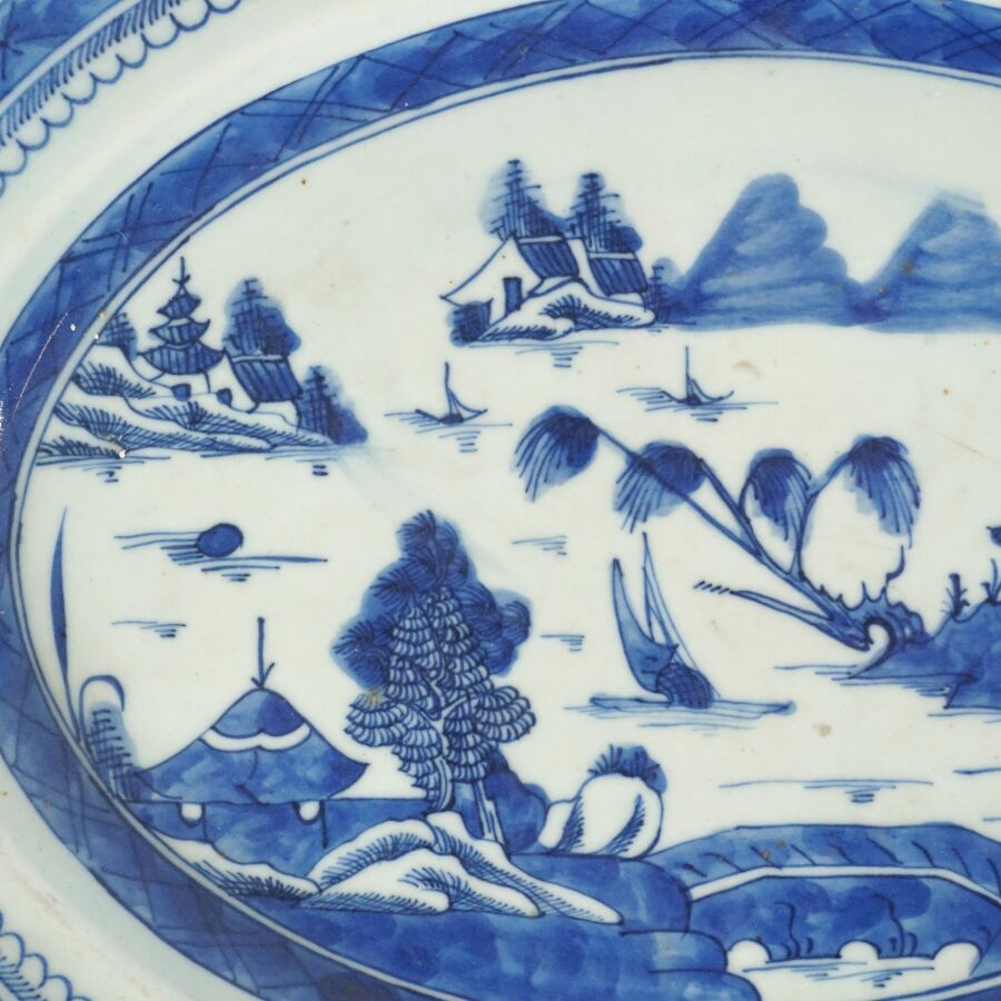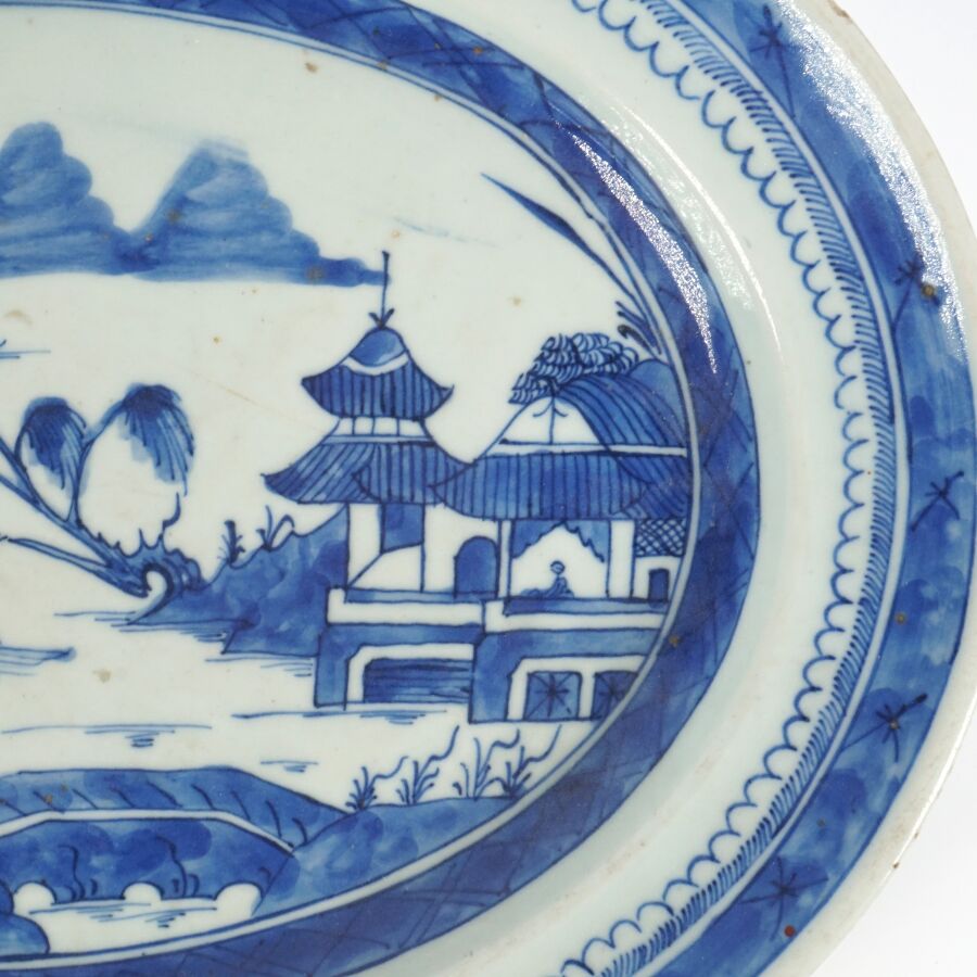 Plat ovale en porcelaine émaillée bleu blanc à décor d'une cité lacustre, Chine, Compagnie des Indes, fin XVIIIe début du 19ème siècle, L. 37,5 cm x 29.5 cm (infime éclat, egrenures).