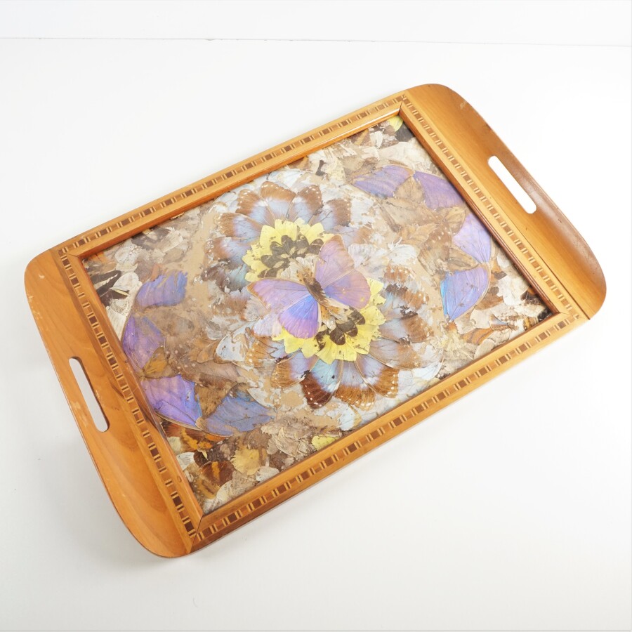 Plateau de service en bois et fond ailes de papillons, 51 x 34 cm.
