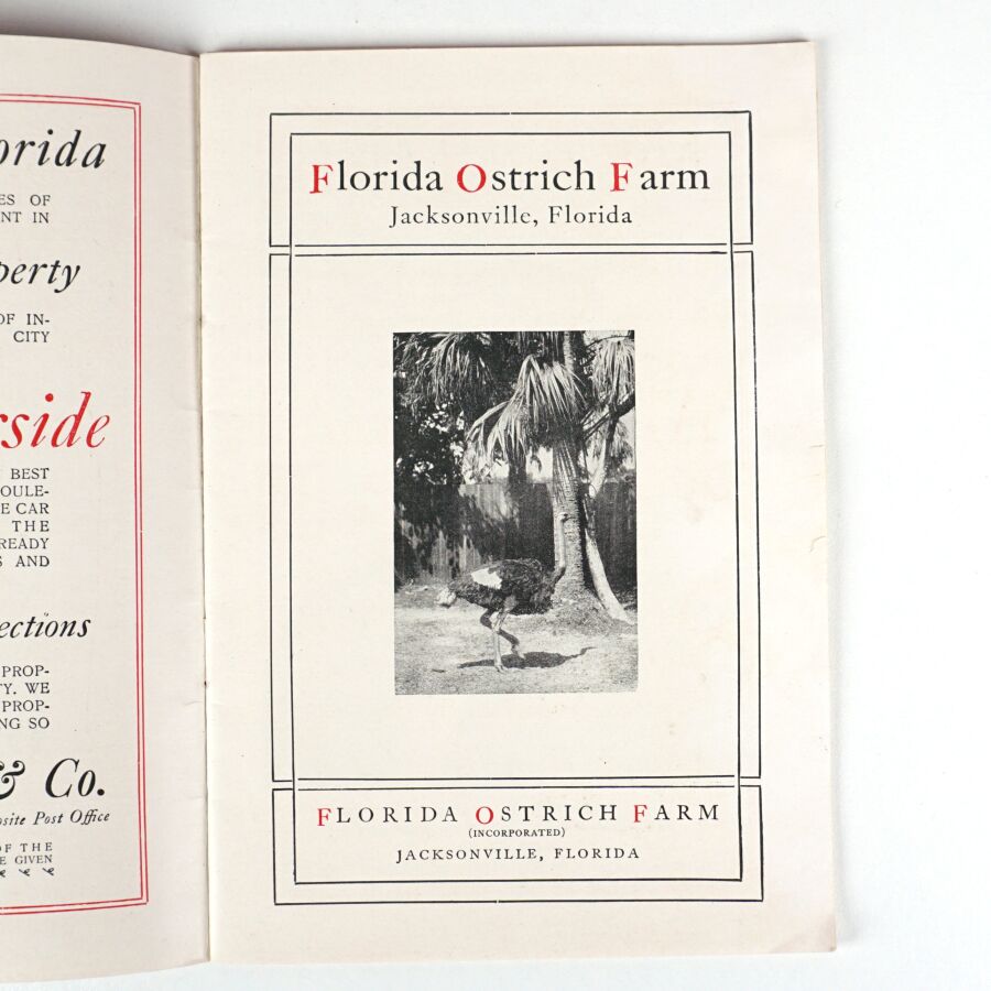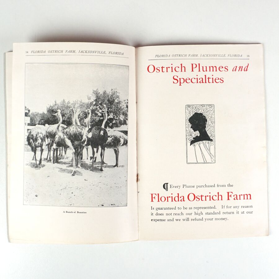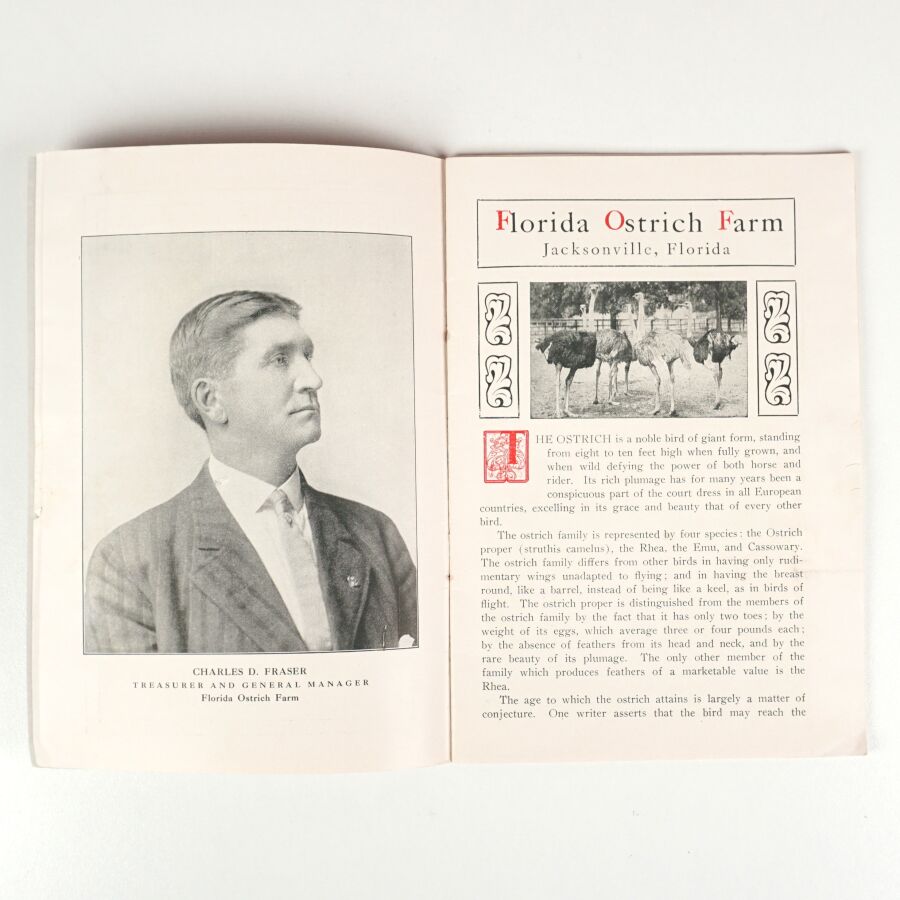 Brochure commerciale en anglais sur un élevage d'autruches en Floride, fondé par Charles D. Fraser, comprenant le prix, la taille et les modèles de plume. Elle est illustrée de photographies.