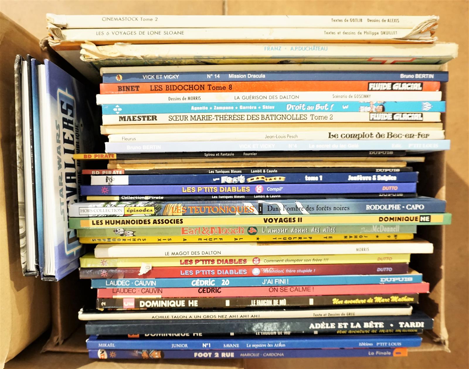 Plus de 100 Bandes-Dessinées en 3 cartons, dont : Astérix, Lucky-Luke, La quête de l'oiseau du temps, Blueberry, Valérian, Les tours de Bois-Maury, Achille Talon, Gotlib et divers.