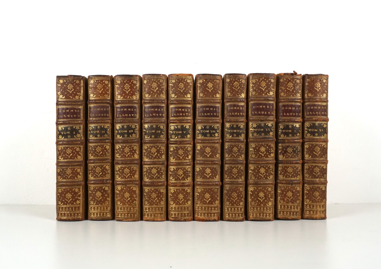 PLUTARQUE - Les vies des Hommes illustres de Plutarque - Amsterdam ; Zacharie Chatelain, 1735 - 10 volumes In-12° - Titres à l'encre rouge et noire, 10 frontispices d'après Elliger, 39 portraits hors texte en médaillons - Reliure de l'époque veau fauve glacé (de menus frottements aux plats et aux coins, plats du tome X partiellement auréolés, 1 éraflure recollée au coin du 1er plat au même volume) - Plats encadrés d'1 triple filet doré, dentelle intérieure - Dos à nerfs ornés (quelques petits accidentes sans manque aux coiffes) - Pièces de titre et de tomaison maroquin bordeaux et brun - Tranches dorées - Bel exemplaire.