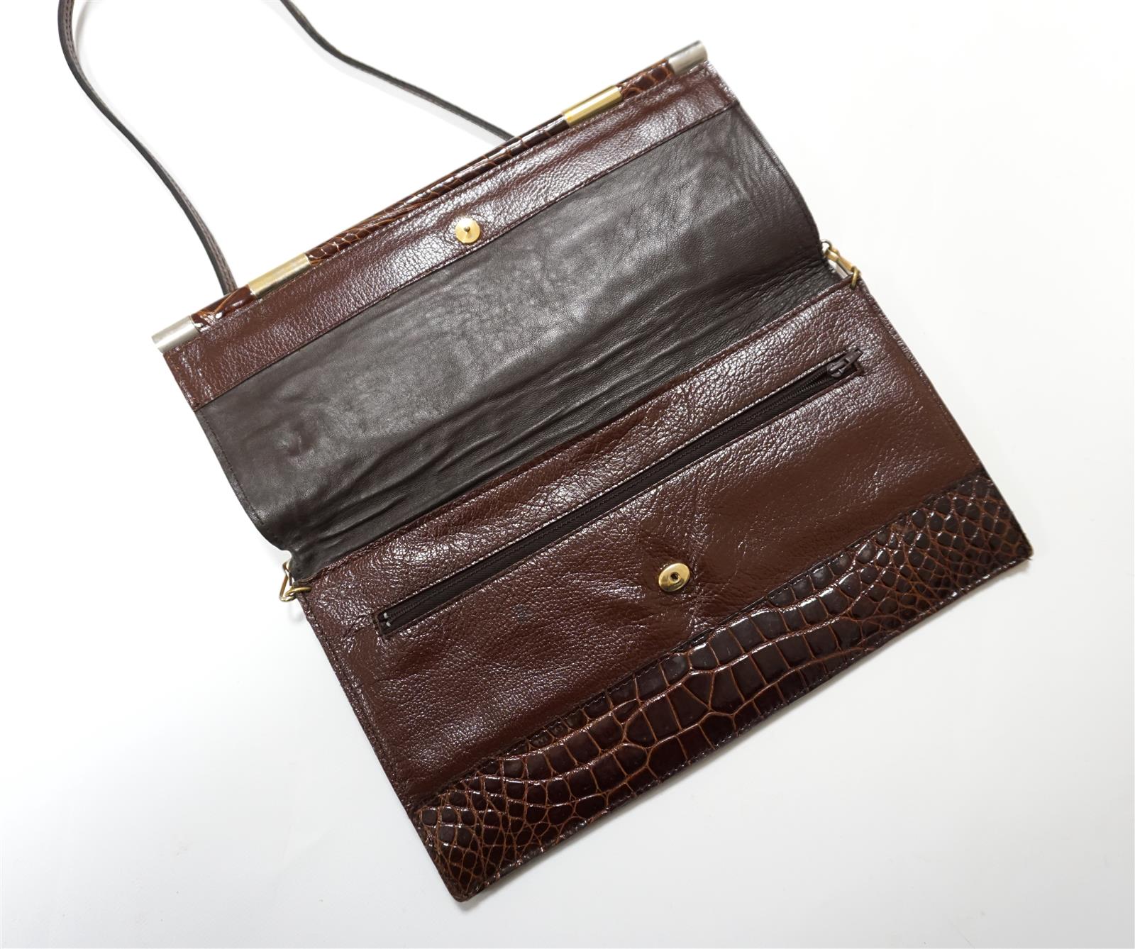 Pochette "vintage" à rabat, porté épaule, en cuir et croco marron, 30 x 16 cm.