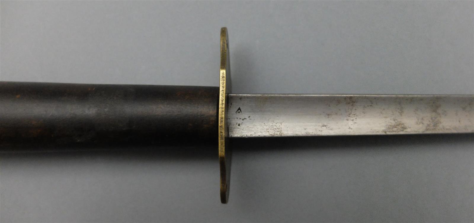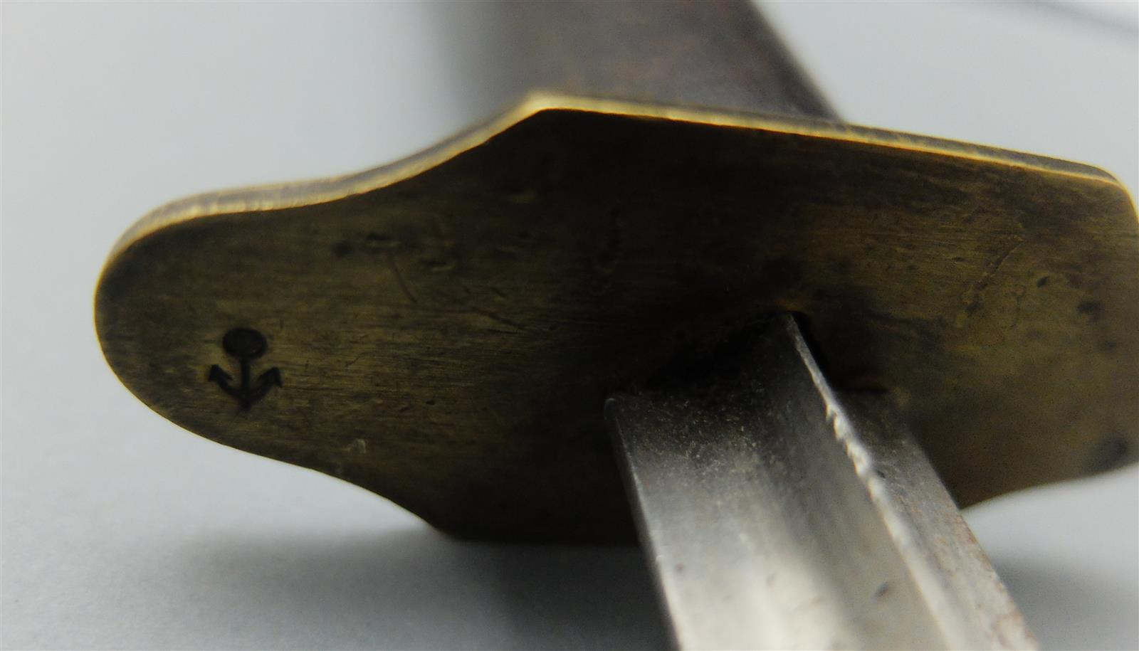 POIGNARD DE MARINE MODELE 1833, PREMIER MODELE, poignée en bois, écrou servant d'anneau de bélière et fixation de la lame, croisière découpée en laiton poinçonnée d'une ancre de marine non cablée, lame de section triangulaire de 17 cm, sans fourreau, TBE.