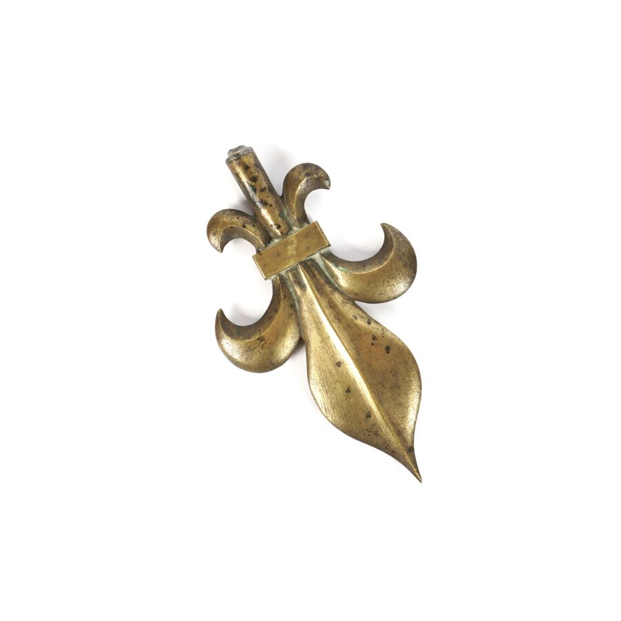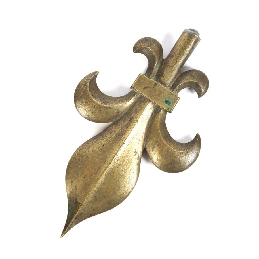 POINTE DE DRAPEAU FLEUR DE LYS, en bronze, montée sur un socle en bois tourné, hauteur sur socle : 16 cm, d'époque Restauration, BE.