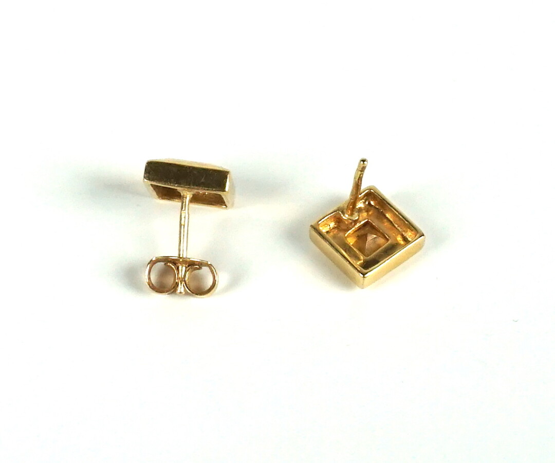 Pointes d'oreilles carrées en or jaune 18K (750/oo), serties au centre d'une pierre jaune, probablement une citrine, 0.8 x 0.8 cm. Poids brut : 3.1 g environ (manque un fermoir).