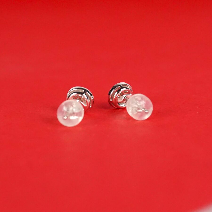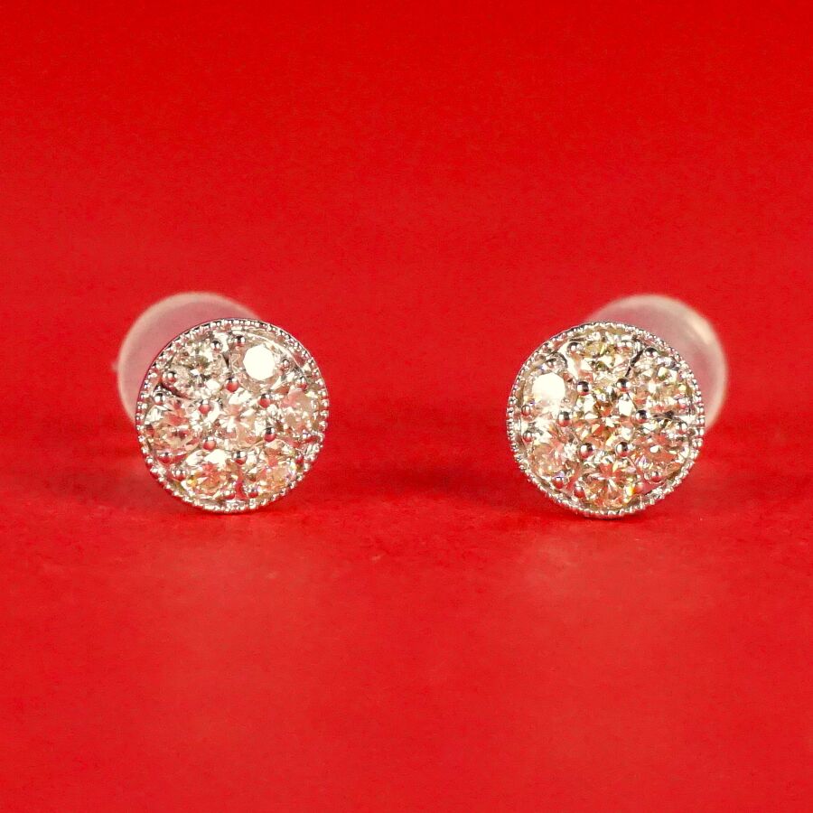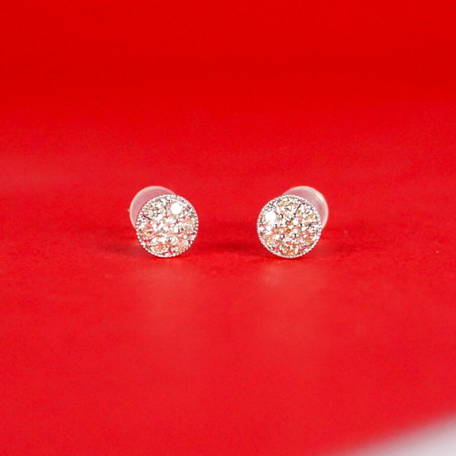 Pointes d'oreilles "Rosace" en or blanc 18K (750/oo) ornées chacune de 7 diamants ronds, l'ensemble des pierres pesant 0.30 ct environ, fermoirs silicone, D. 0.6 cm. Poids brut : 1 g environ.