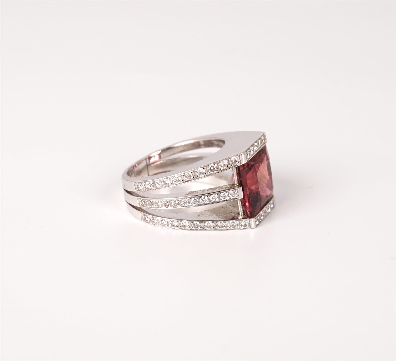 POIRAY : Bague en or gris 18K (750/oo) formée de trois anneaux sertis de brillants, ornée au centre d'une tourmaline rose. Signée et numérotée 87334. TDD 54. Poids brut : 14,5 g environ.