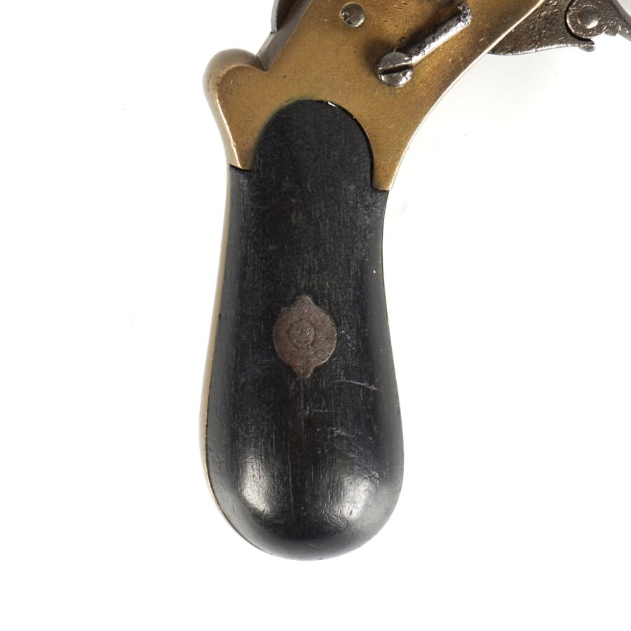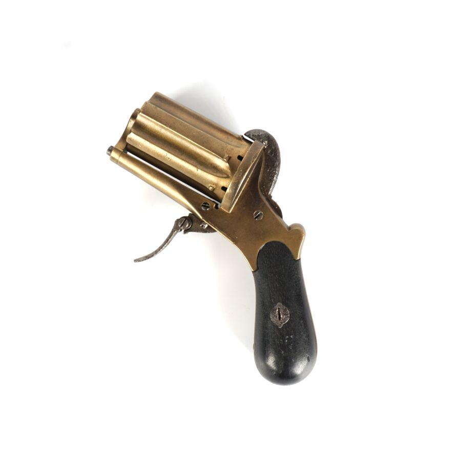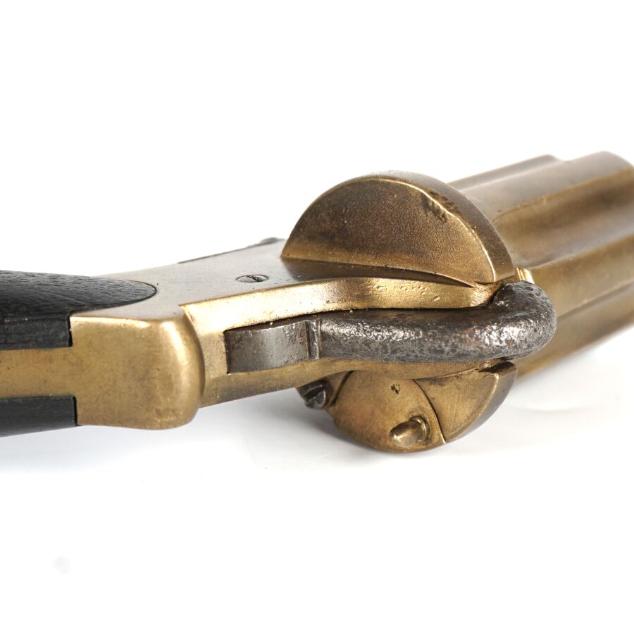 POIVRIERE A BROCHE DITE DE CURE, calibre 7 mm, 6 coups à 6 canons, carcasse en laiton, détente rentrante piquée, plaquettes de la poignée en bois noirci, chien piqué, mécanisme non fonctionnel (mécanisme du chien à revoir), longueur totale : 12.5 cm, EM/ABE.
