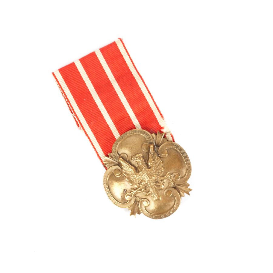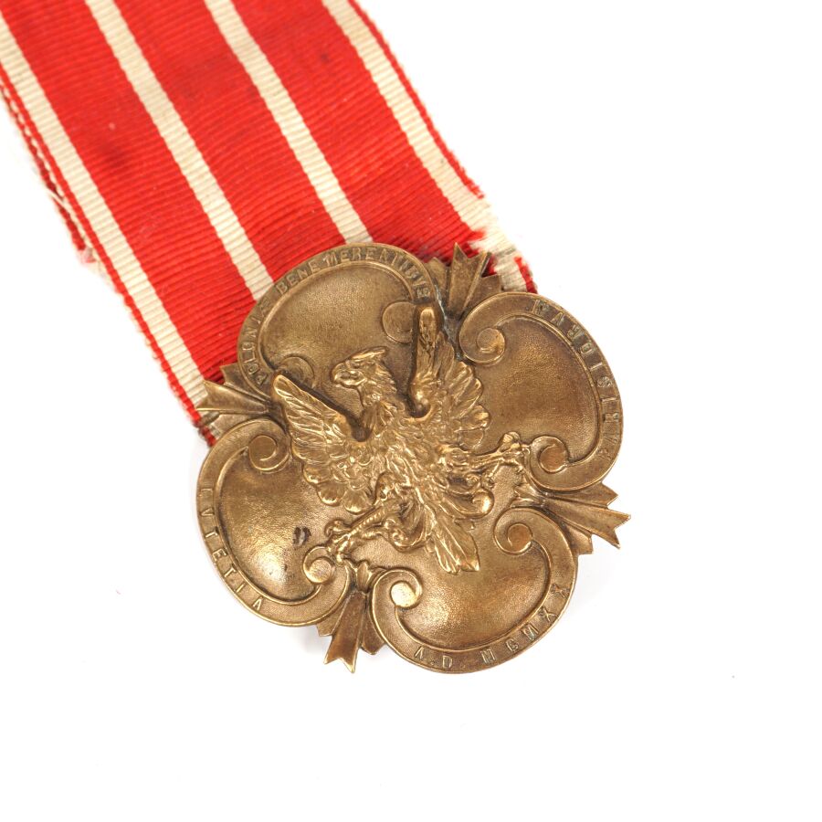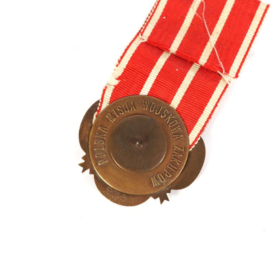 POLOGNE - MEDAILLE COMMEMORATIVE DE LA COMMISSION MILITAIRE D'ARMEMENT (1920), en bronze patiné, marquée sur le pourtour " POLONIAE BENE MERENTIBUS LUTETIA A.D. MCMXX PARISIORUM ", 45 x 45 mm, numéro gravé au revers " 284 ", fixation par disque, ruban rouge à 4 rayures blanches, vers 1920, TBE.