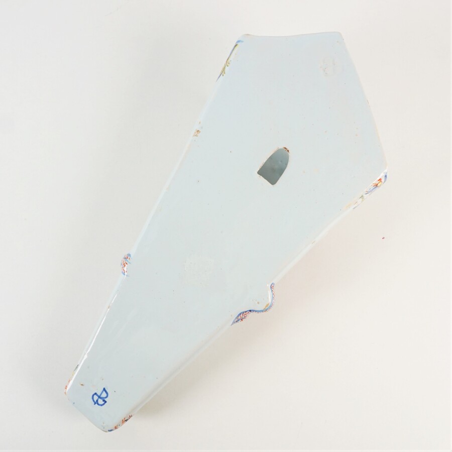 PORQUIER-BEAU : Bouquetière d'applique en faïence émaillée polychrome à décor rouennais au carquois, marqué au dos en bleu et en creux, H. 31 cm.