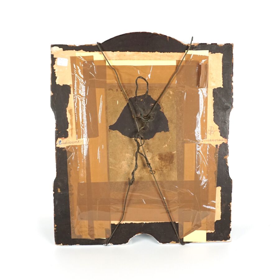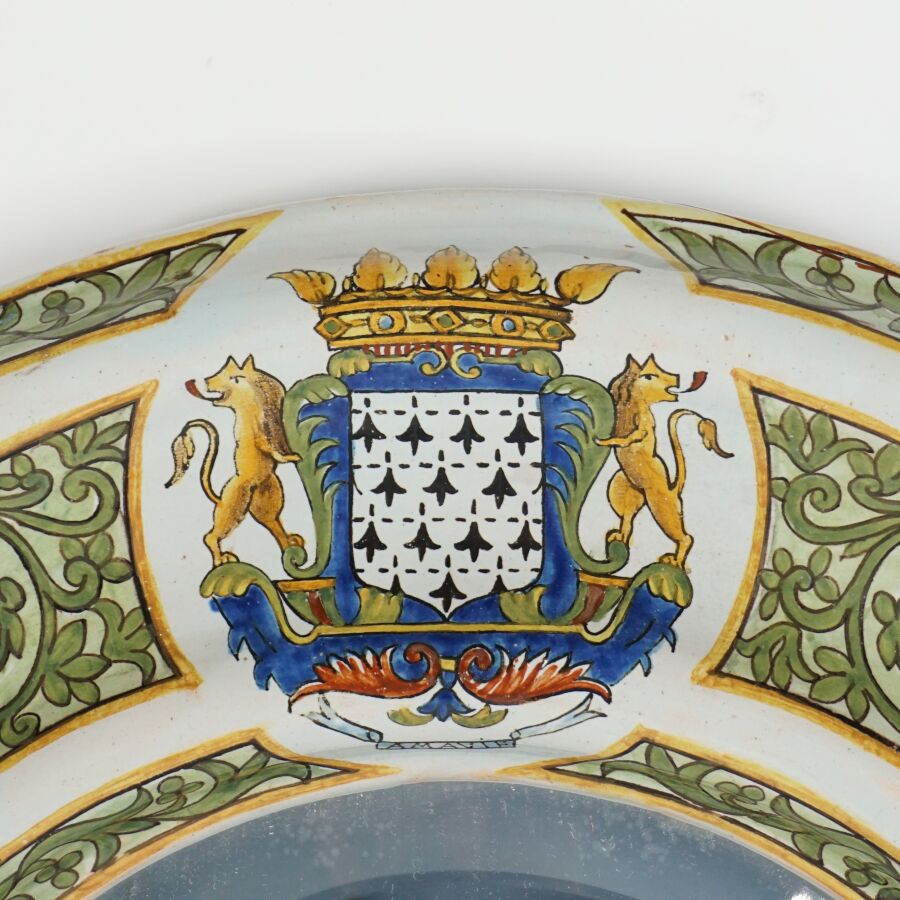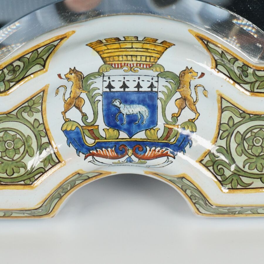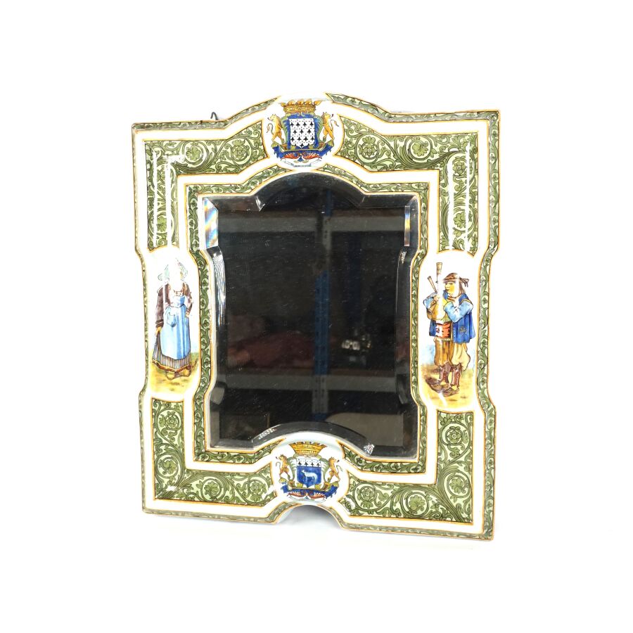 PORQUIER-BEAU - QUIMPER : Miroir en faïence émaillée polychrome aux armes de Quimper et sommé des armes de Bretagne, orné de deux macarons portant un couple de Fouesnantais et bordé de rinceaux feuillagés en vert, Dim. 46 × 40 cm.