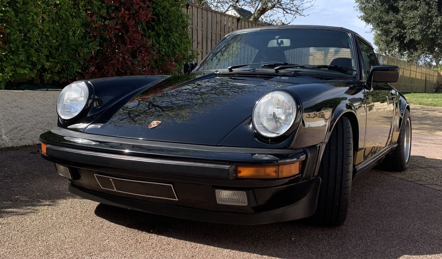 PORSCHE 911 Carrera 3L2 du 01/01/1988, production le 01/10/1987, Cabriolet 2 portes, 4 places, carte grise française de collection n° de châssis : WPOZZZ91ZJS170612, n° de série : WPOEB091XJS170612, 263825 km au compteur. Livret d'entretien disponible. Voiture en provenance des USA ayant été restaurée par l'ancien propriétaire (40000 € de factures). Carrosserie très saine de couleur noire avec de grandes inscriptions « Carrera » noires sur bandes or de chaque côté, gros pare-chocs noirs avec butoirs caoutchouc sur l'arrière. Capote de toile noire en parfait état. Sellerie cuir noir en excellent état ainsi que les panneaux de portes et les moquettes. Le tableau de bord est bien complet de ses instruments de contrôle et tout fonctionne. Volant sport à 3 branches gainé cuir. Moteur 6 cylindres à plat, 3164 cm3, 231CV, 17CV fiscaux en parfait état de marche, boite G50 à 5 rapports. Pneumatiques en bon état, jantes Fuchs de 16 pouce en alliage léger.