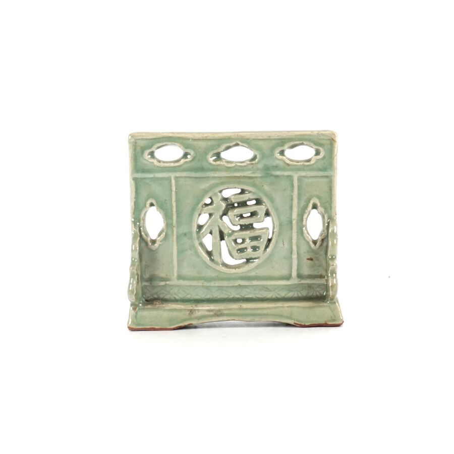 Porte baguettes à encens, reprenant la forme d'un écran de lettré en céramique émaillée céladon à décor ajouré d'une calligraphie "bonheur", Chine, époque Qing, Dim 15,5 x 16.8 cm.