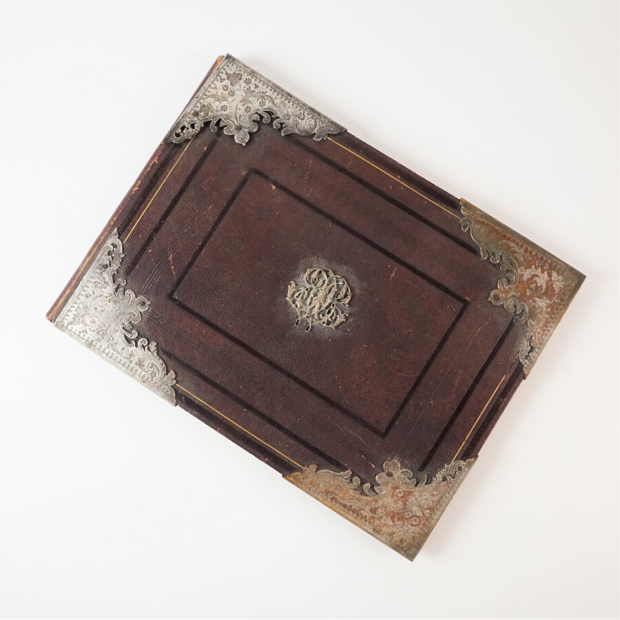 Porte dessin rectangulaire, monture en argent à motif feuillagé dans les coins et d'un chiffre sur le plat, L. 34.5 cm, H. 25.7 cm (petites usures, traces d'écritures sur certaines pages).
