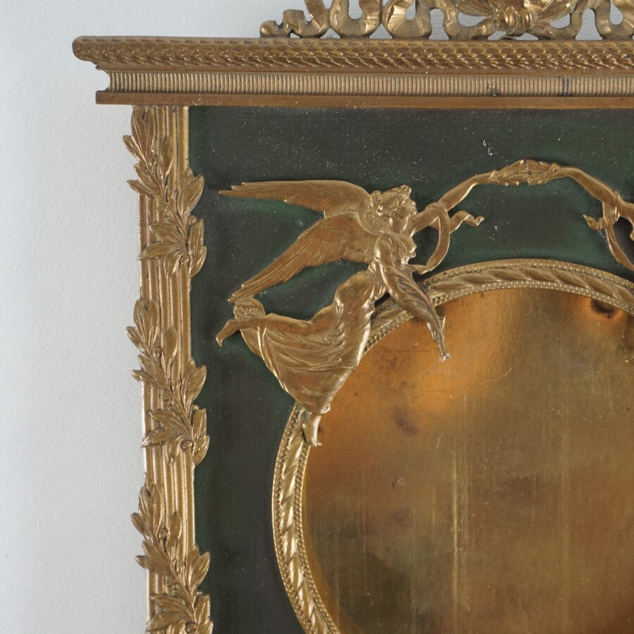 Porte-photo, cadre en métal doré et laqué, à décor d'allégories de chimères, feuillages et guirlandes de ruban, style Empire, H. 21.5 cm x 12.5 cm.