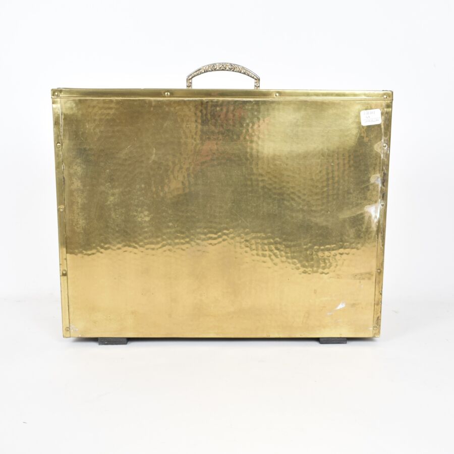 Porte-revue en métal martelé à deux compartiement, décoré d'un motif de coquille stylisée en relief, la poignée supérieure en métal, l'intérieur en bois noircit, (usures, taches sur le bois noirci). 28 x 36 cm.