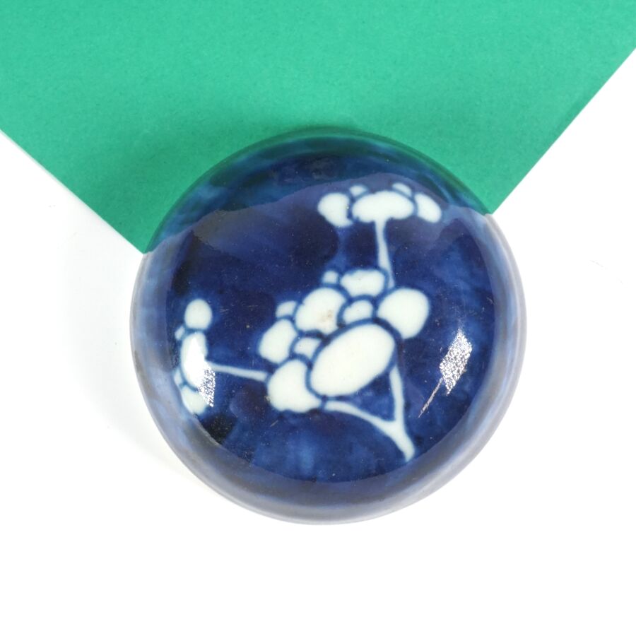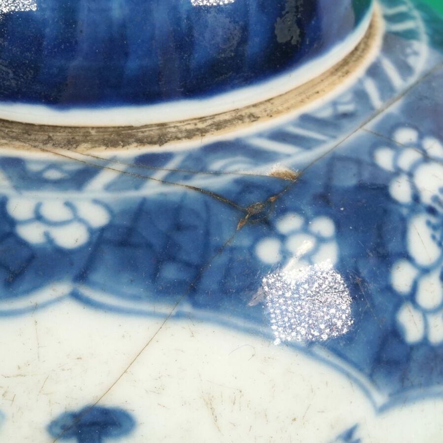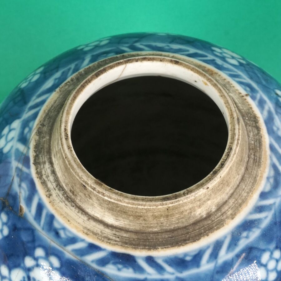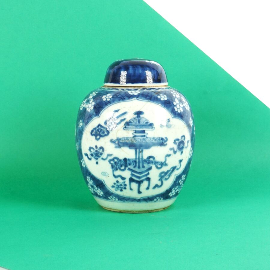 Pot à gingembre couvert, en porcelaine blanche, à décor en bleu sous couverte, en médaillons d'objets mobiliers sur fond de fleurs de prunus et glace brisée, Chine, 19ème siècle, H. 17.5 cm (couvercle rapporté, importante restauration).