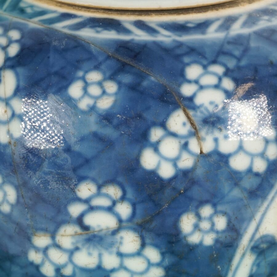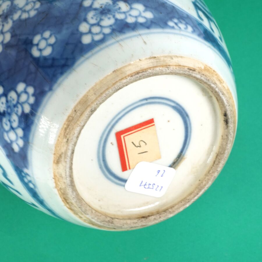 Pot à gingembre couvert, en porcelaine blanche, à décor en bleu sous couverte, en médaillons d'objets mobiliers sur fond de fleurs de prunus et glace brisée, Chine, 19ème siècle, H. 17.5 cm (couvercle rapporté, importante restauration).