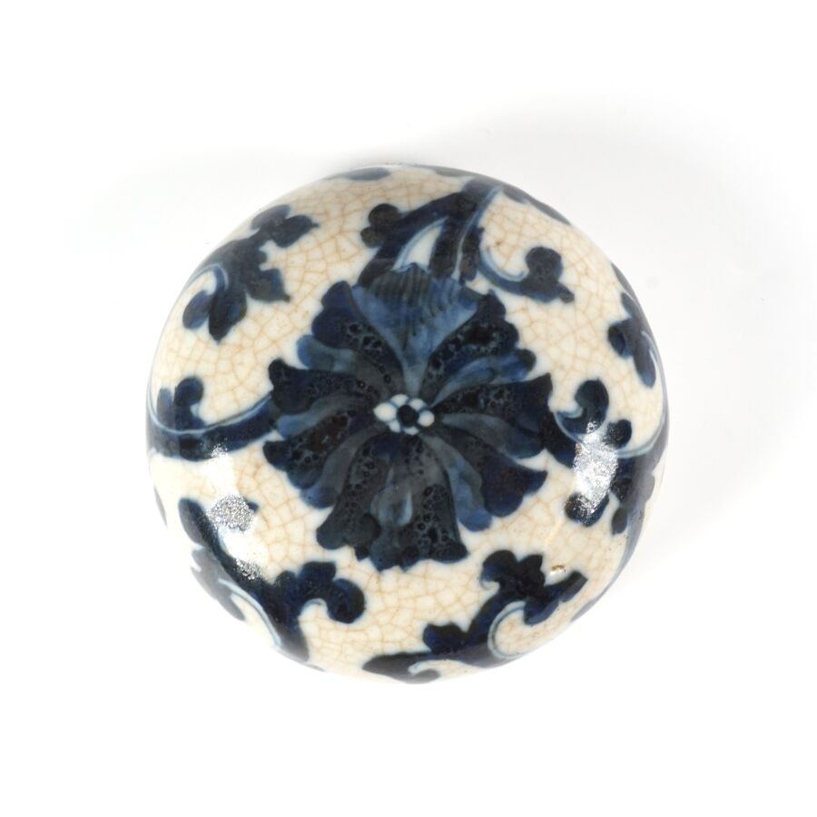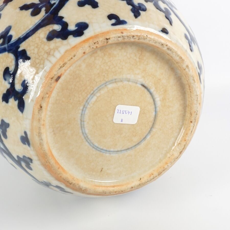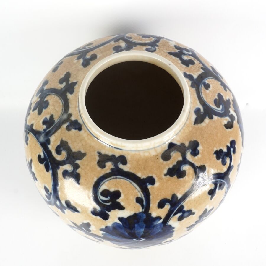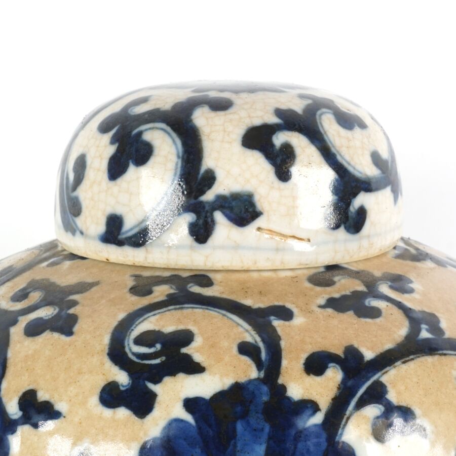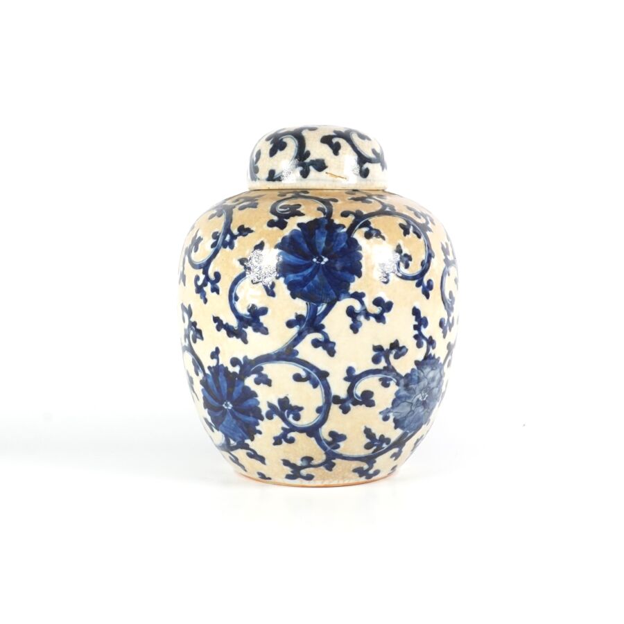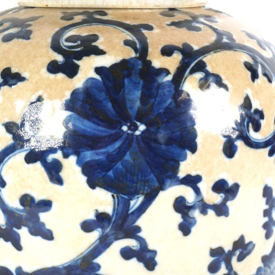 Pot à gingembre couvert en porcelaine émaillée beige à décor en bleu de fleurs de lotus et rinceaux, Chine, circa 1900, H. 31 cm (défaut de cuisson sur le couvercle).