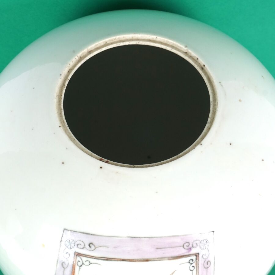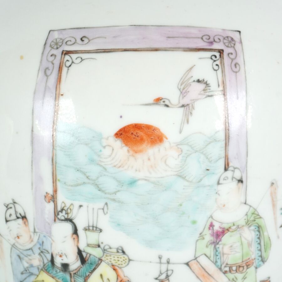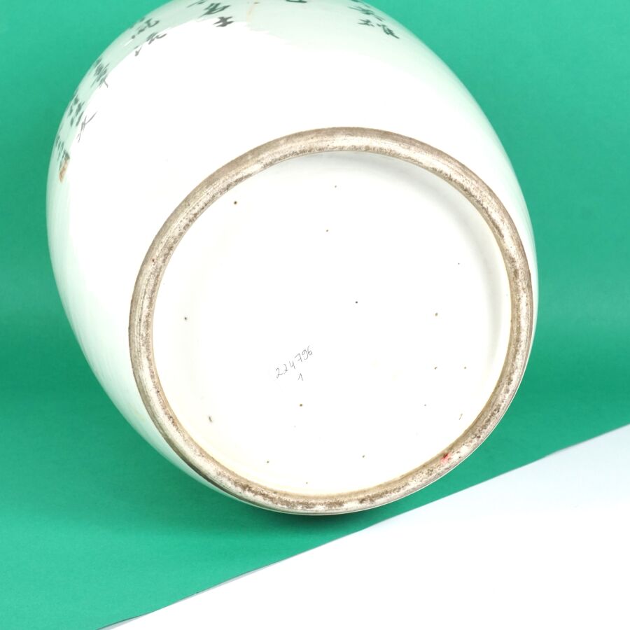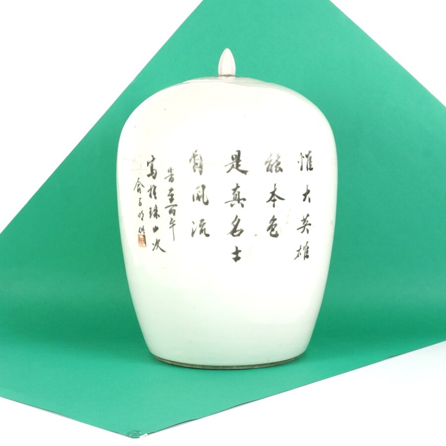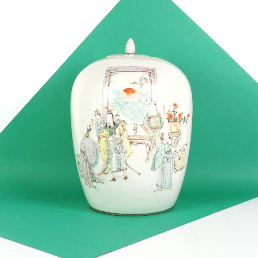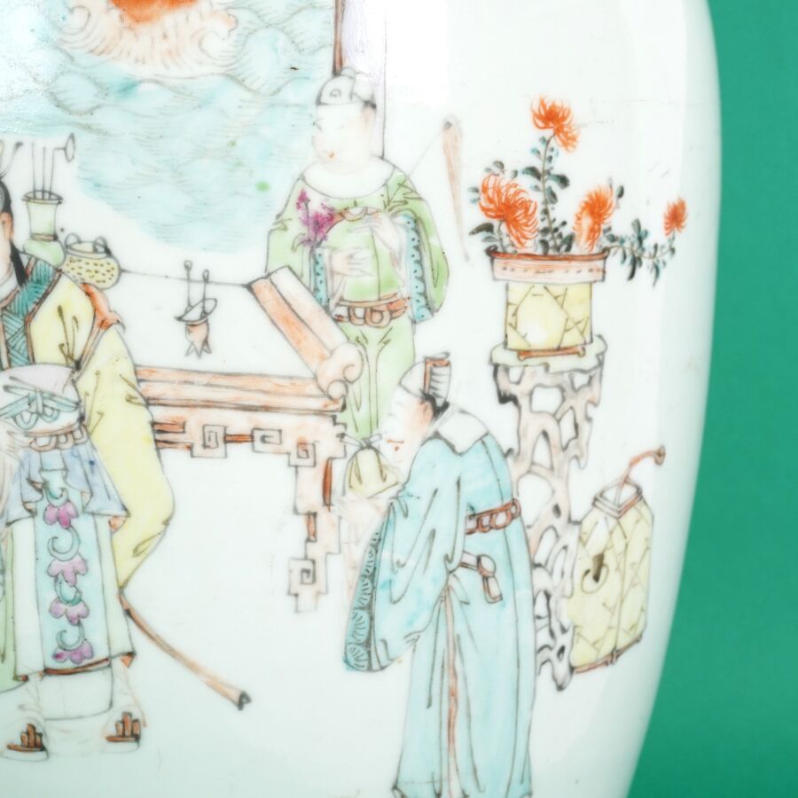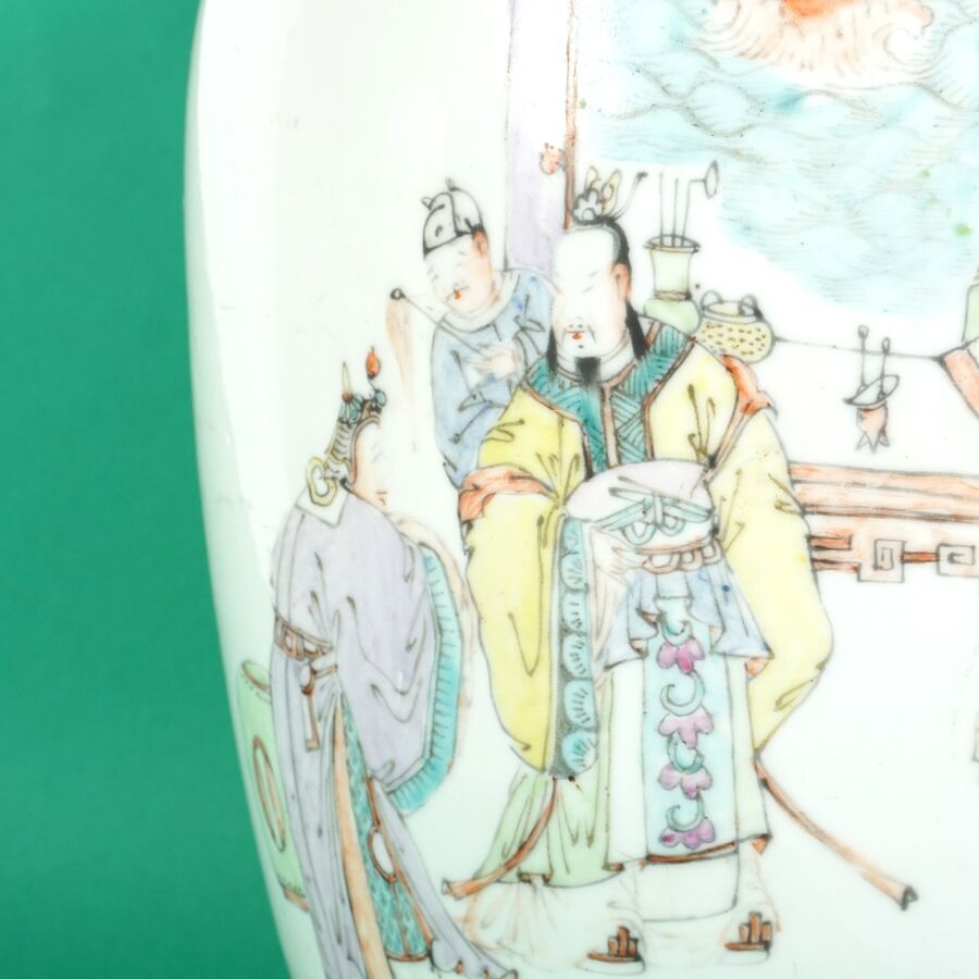 Pot à gingembre de forme balustre en porcelaine et émaux de style famille rose à décor de haut dignitaires sur une face et de caractères calligraphiques au revers, Chine, début du 20ème siècle, H. 32 cm.