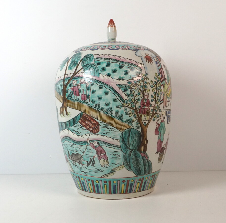 Pot à gingembre de forme ovoïde en porcelaine et émaux polychrome à décor tournant de scène de travail au champs et au tissage, Chine, 20e siècle, H.31cm.