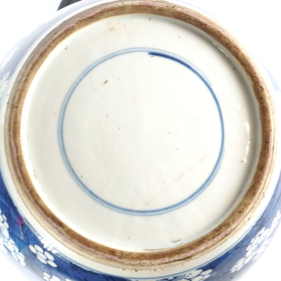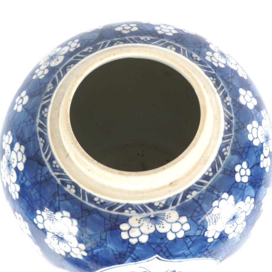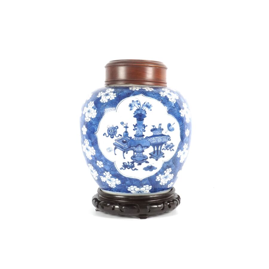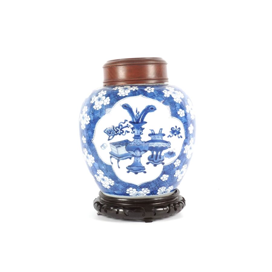 Pot à gingembre en porcelaine bleu blanc à décor en réserve en médaillons d'objets mobiliers sur fond de fleurs de prunus. Couvercle en bois rapporté, marque au double cercle sur la base, Chine, 18ème siècle, H. Totale : 30 cm environ. H. Hors tout : 23 cm.