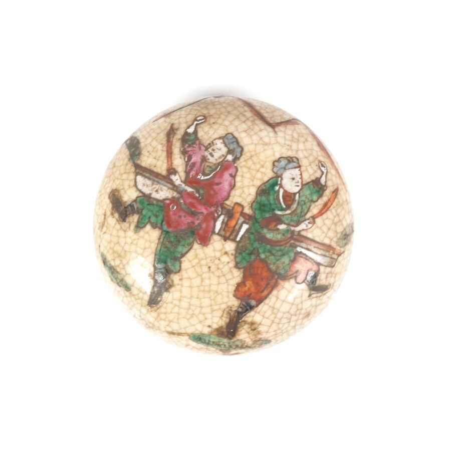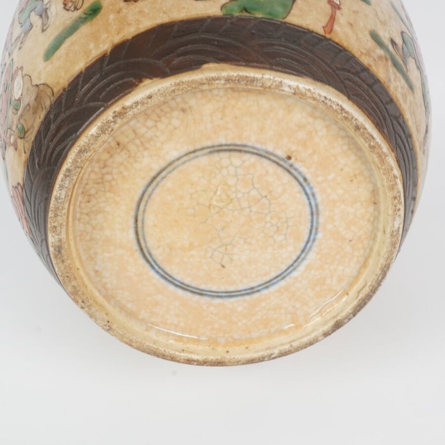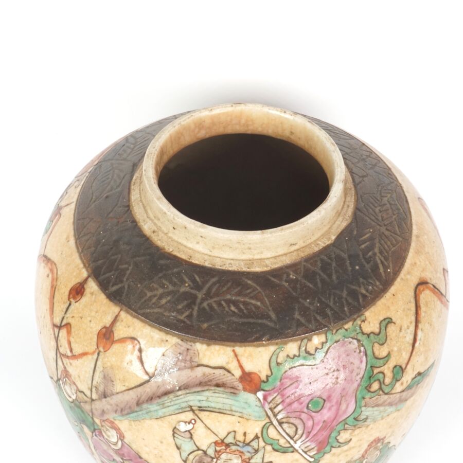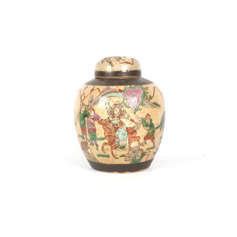Pot à gingembre en porcelaine émaillée polychrome à décor tournant de scènes de bataille, avec son couvercle, Nankin, Chine, H. 26.5 cm.
